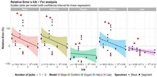 As indicated in some model deductions, besides materials inputs/characteristics (evaluated in parametric analysis), some geometric parameters such as the width ratio (b1/b) and specimens’ aspect ratio (h/b) are expected to influence the prediction. Thus, they can also be relevant in models’ relative errors and, consequently, affect the models’ safety factor used in design. Aiming at evaluating the influence of specimens’ width and aspect ratios, in the relative errors, some scatter plots with linear regression models (with the linear regressions 95 percent confidence intervals) are exposed in Figure 6 and Figure 7.