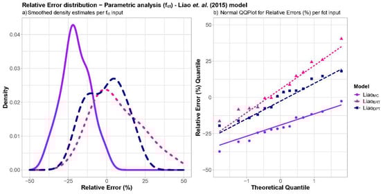 Considering the response obtained by the model of Liao et al. [], a more in-depth analysis was conducted to evaluate the analytical response obtained. Figure 9 shows the probability density estimates and normal qqplots for the relative errors (%) for the model of Liao et al. [].