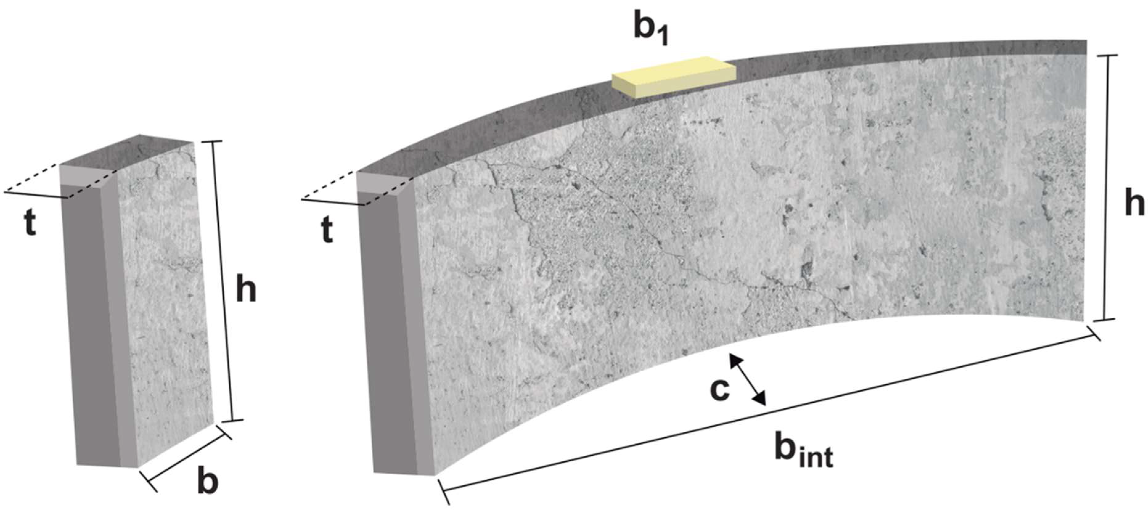 A review of the studies from 2001 to 2022 regarding experimental programs focused on evaluating precast segments under concentrated loads was conducted. The studies can be divided into two main groups: concrete blocks and full/partial-scale specimens (testing concrete segments with curvature). Figure 3 illustrates the geometrical dimensions for concrete blocks and full/partial-scale segments, in which t is the thickness, b is the base length, and h is the height of the specimen. The parameter c is a dimension created to assess the curvature of the segment, bint is an internal base length of the segments, and b1 is the length in which the load is applied.