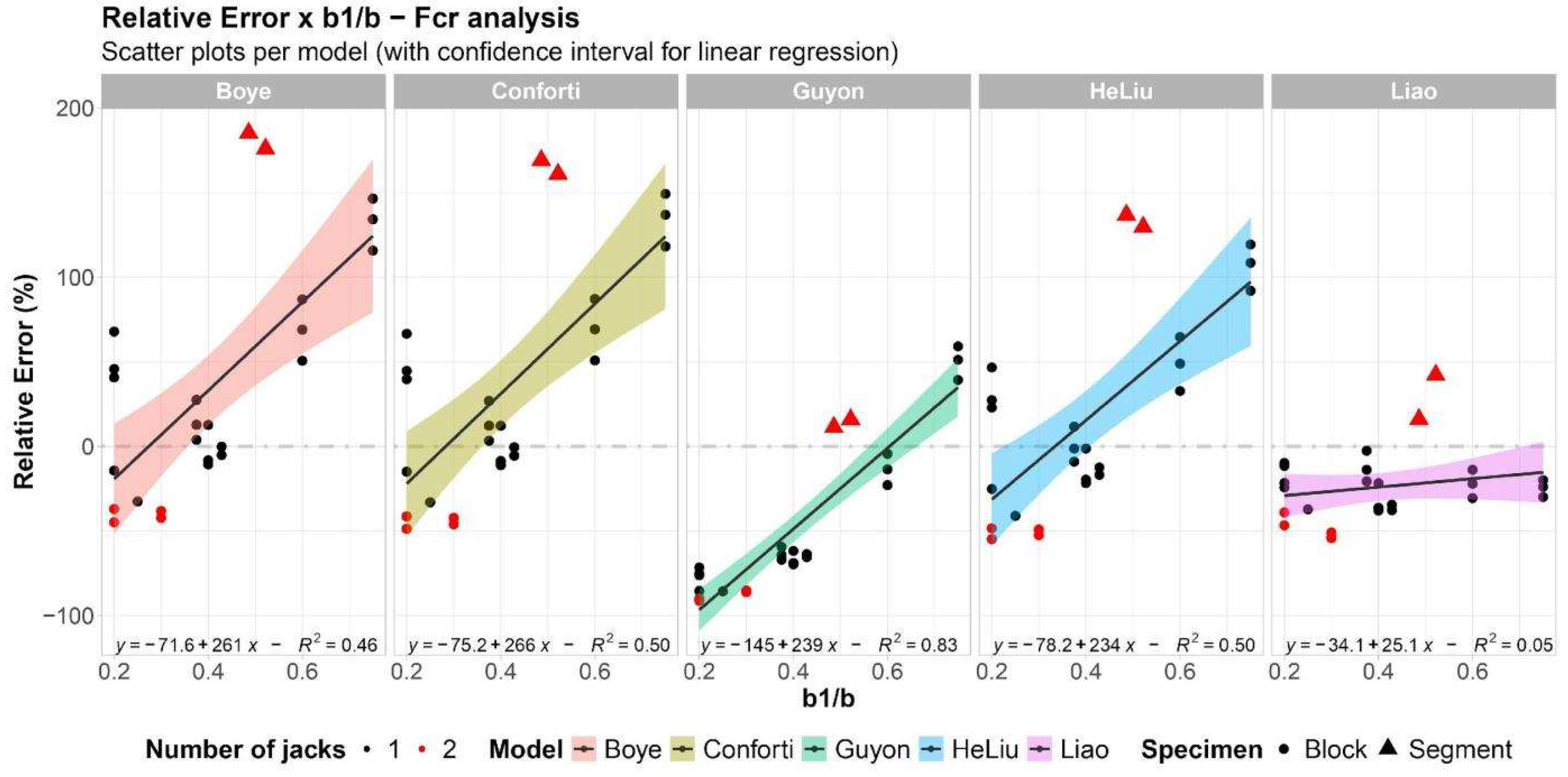 The results for blocks with two jacks (red dots) seemed closer to all models’ configurations with a single jack (black dots). As for the segments tested with two jacks (red triangles), Guyon’s [17] model presented the closest responses to regression, while the other models exhibited some values apart from the expected ones. Unfortunately, the limited usable results in this condition make comparison analysis impractical.