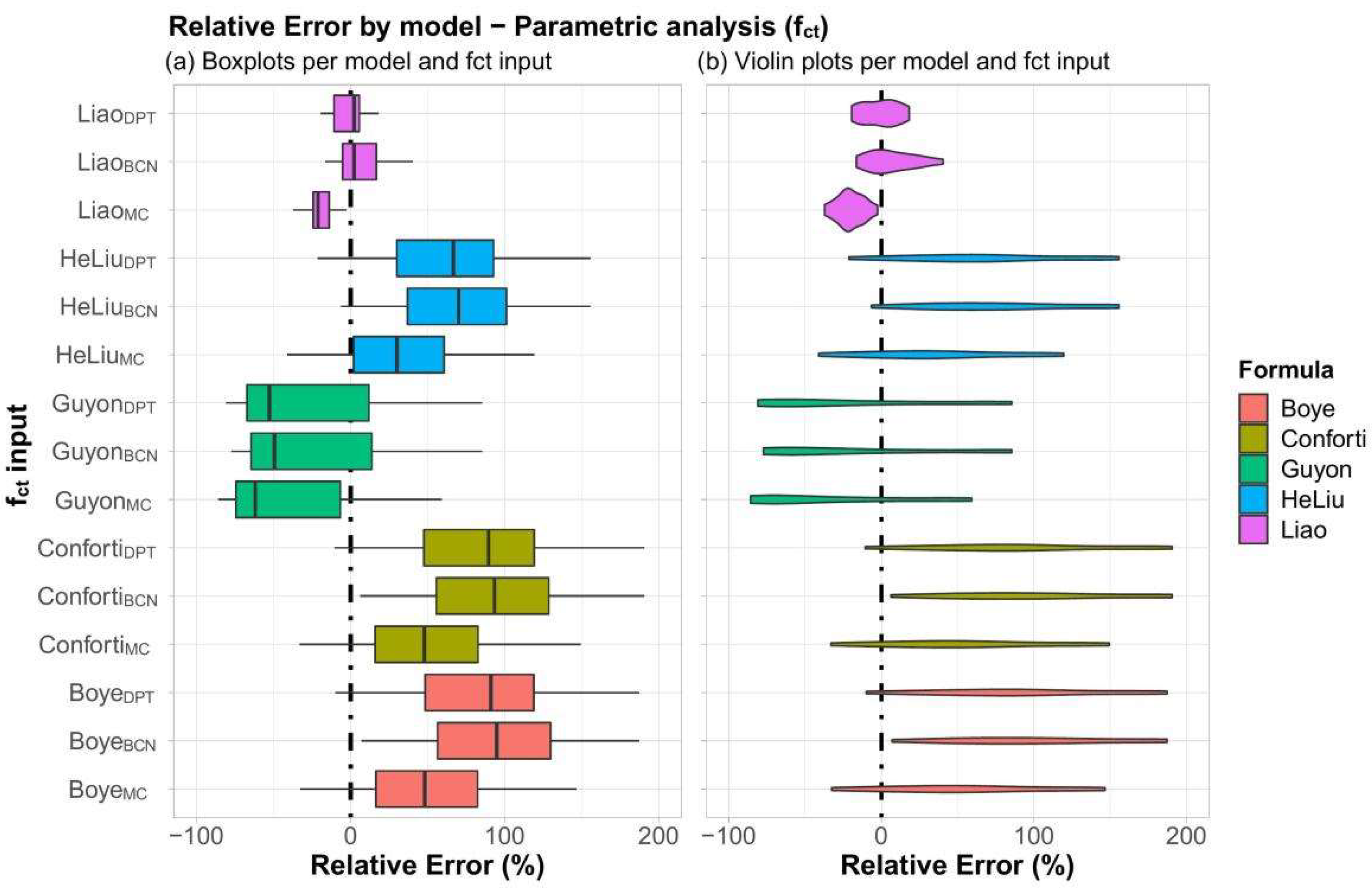In this section, the influence of using the fib Model Code approach to estimate the matrix tensile strength (fMC), the experimental tensile strengths determined by the DPT (fDPT), or the Brazilian test (fBRT) for the prediction of each analytical model was analyzed. Figure 8 illustrates the relative error box and violin plots as a function of the input tensile strength.
