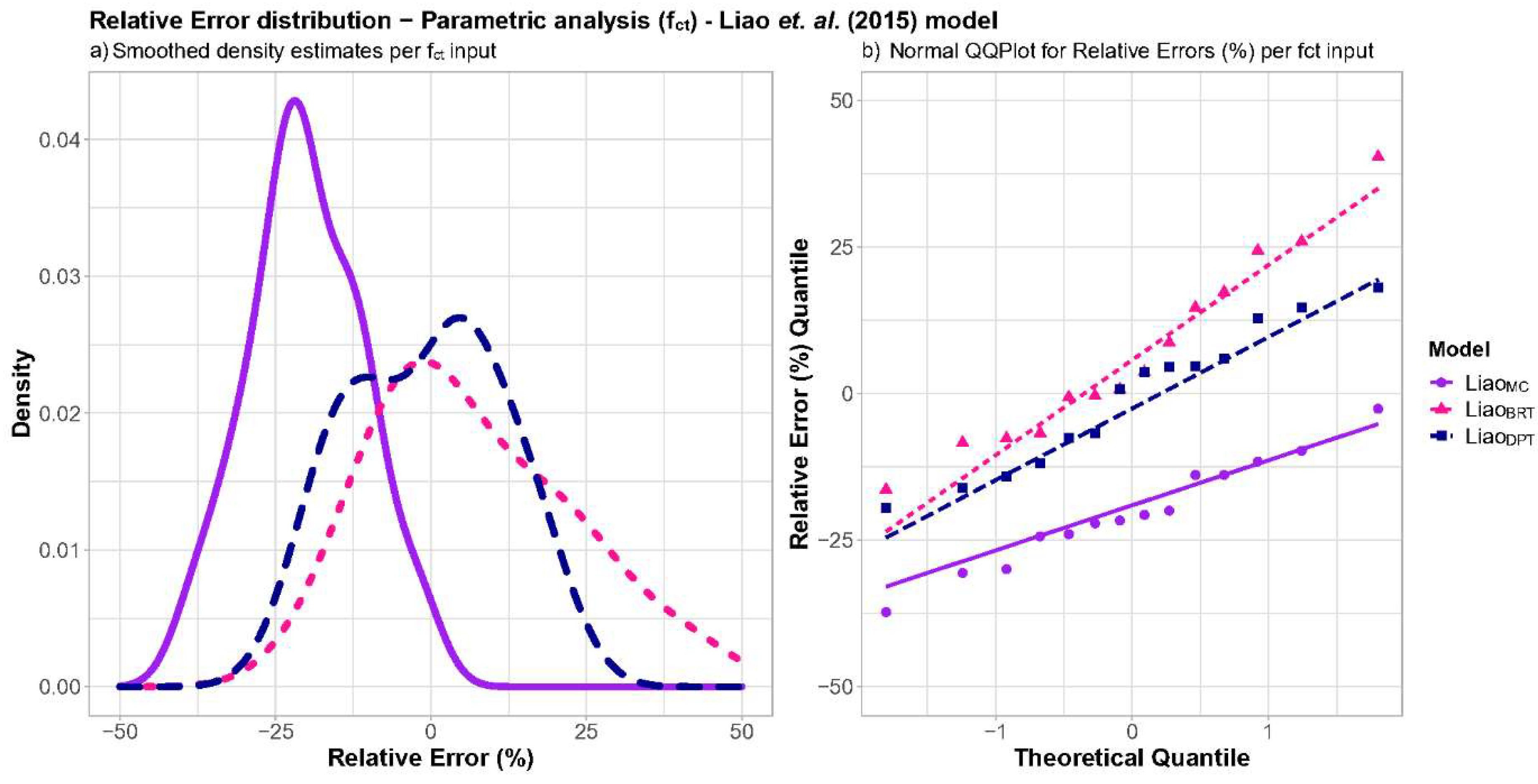 It is important to remark that the model proposed by Liao et al. [20] yielded relative errors approximately centered at zero when using fDPT or fBRT. Moreover, the violin plots indicate a wide distribution of relative errors for all the models evaluated. The lowest range of relative errors was verified in the model proposed by Liao et al. [20], with a range lower than 50% and the lowest IQR values regardless of employing fMC, fDPT or fBRT. These factors may indicate that the model proposed by Liao et al. [20] has higher accuracy and precision than the other models evaluated in this study, especially when employing experimental input values of fDPT or fBRT.