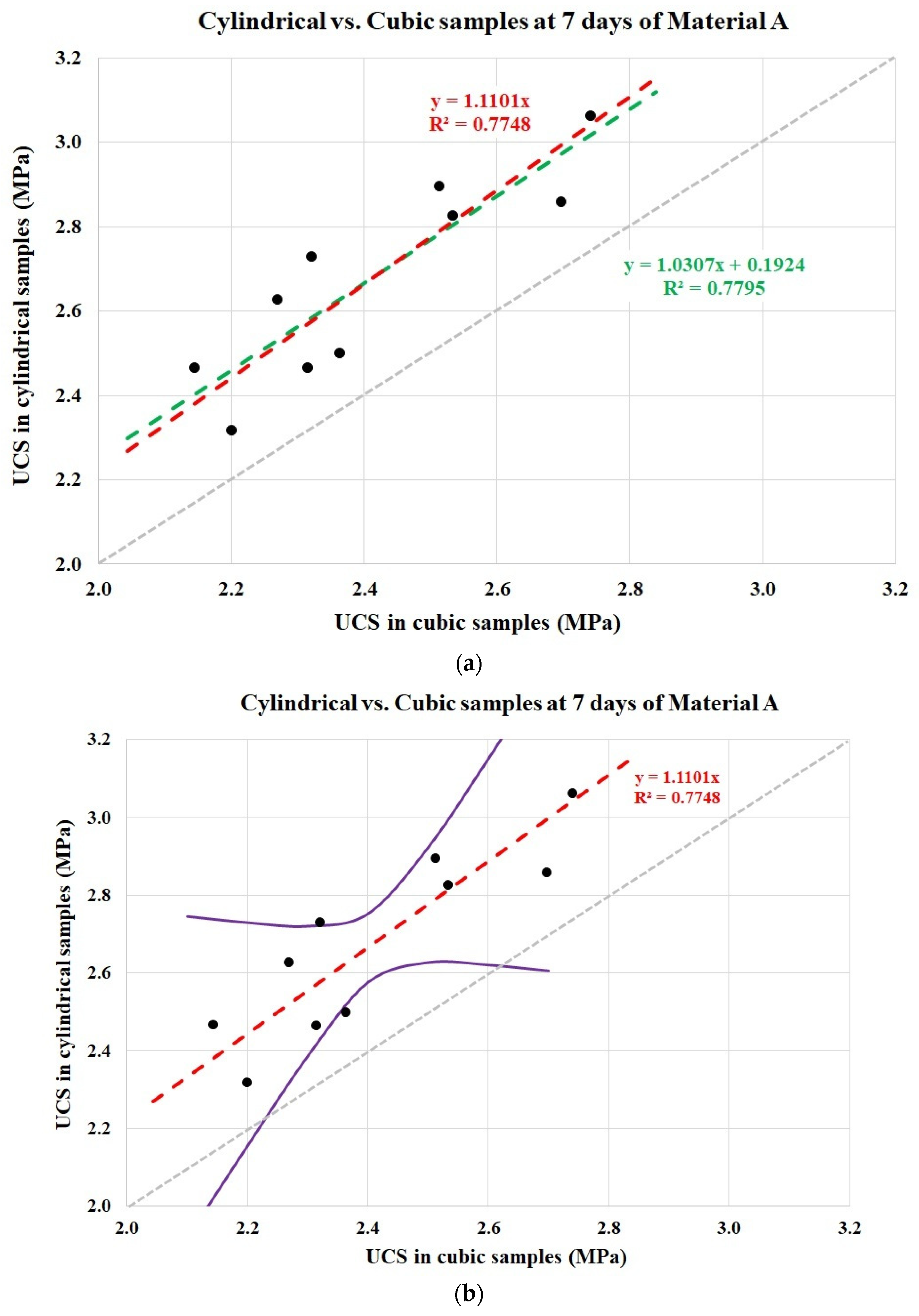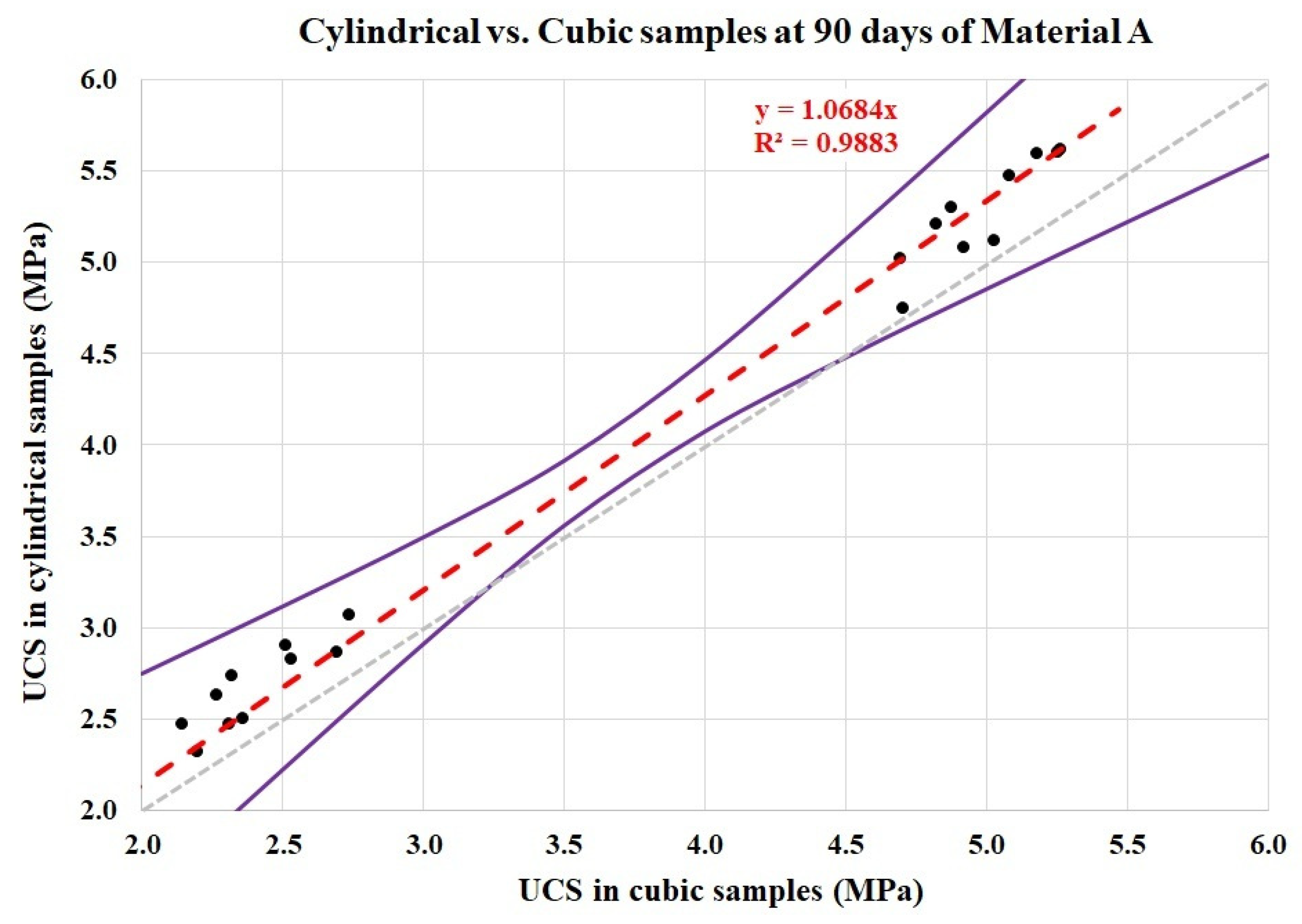 67]. Nevertheless, the point to be underlined is that the resulting shape coefficient, 1.04, obtains a higher accuracy than those obtained by the specimens individually in the same range of strength, with all the data points within the 95% CI range. For specimens of Material A tested at 7 days, the determination coefficient of the relationship between them was only 0.77; for samples of Material A tested at 90 days, the