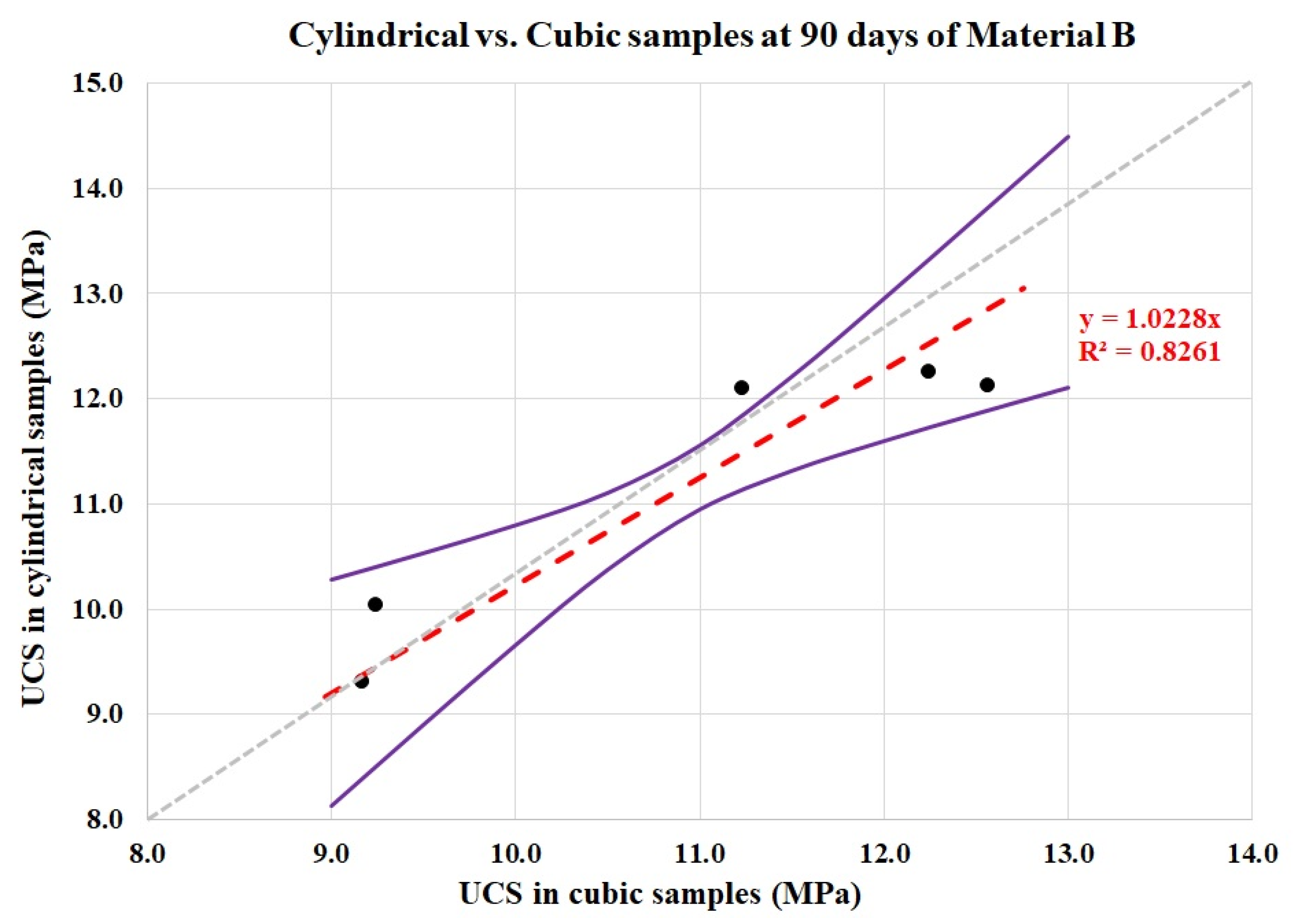 x, the UCS value in cubic samples. As shown, the determination coefficient is high, near 0.80, and the shape coefficient indicates that the UCS in cylindrical samples is 1.11 times higher than in cubic samples. In fact, all the data points at 7 days indicate that higher values are obtained in cylindrical samples. The gray line shows the equality line, i.e.,