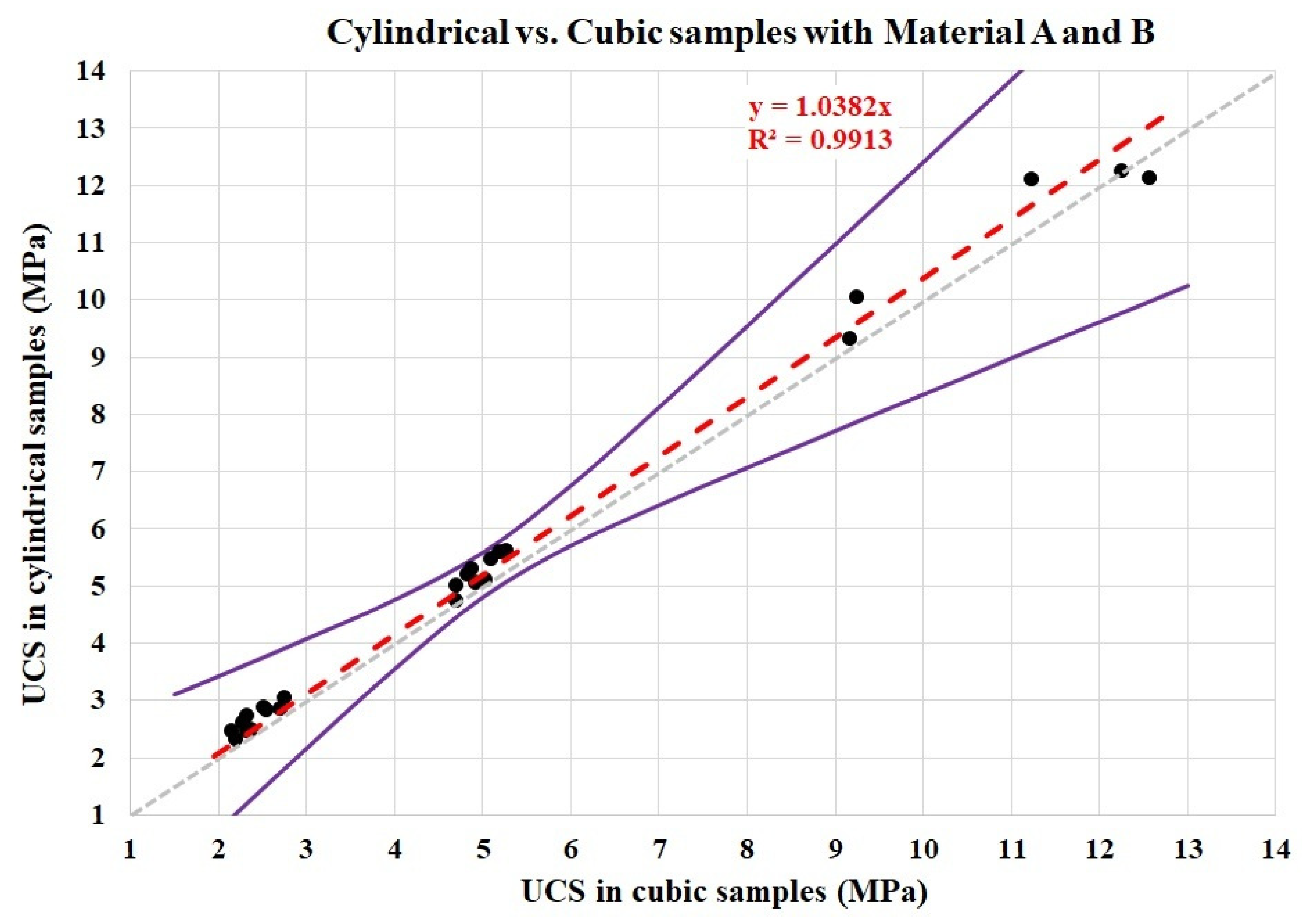69]. The gradual convergence of cube and cylinder strengths at higher UCS levels also reflects a reduction in lateral dilation and in the influence of end-restraint, meaning that as the material becomes stronger and less deformable, geometric effects diminish and