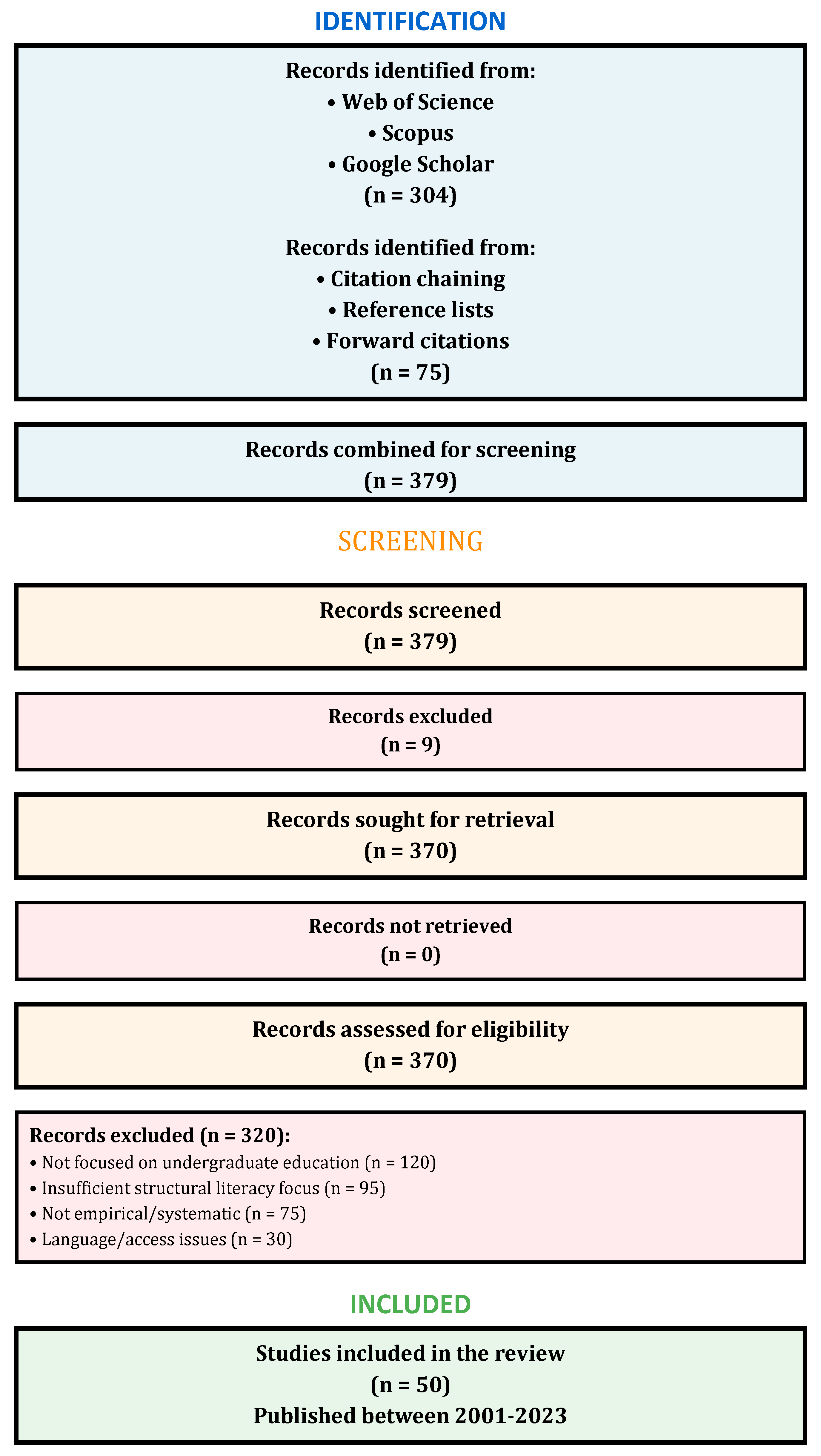 | ELIGIBILITY | 6 | Records excluded with reasons | 320 records excluded: Not focused on undergraduate education (n = 120), Insufficient structural literacy focus (n = 95), Not empirical/systematic (n = 75), Language/access issues (n = 30) |