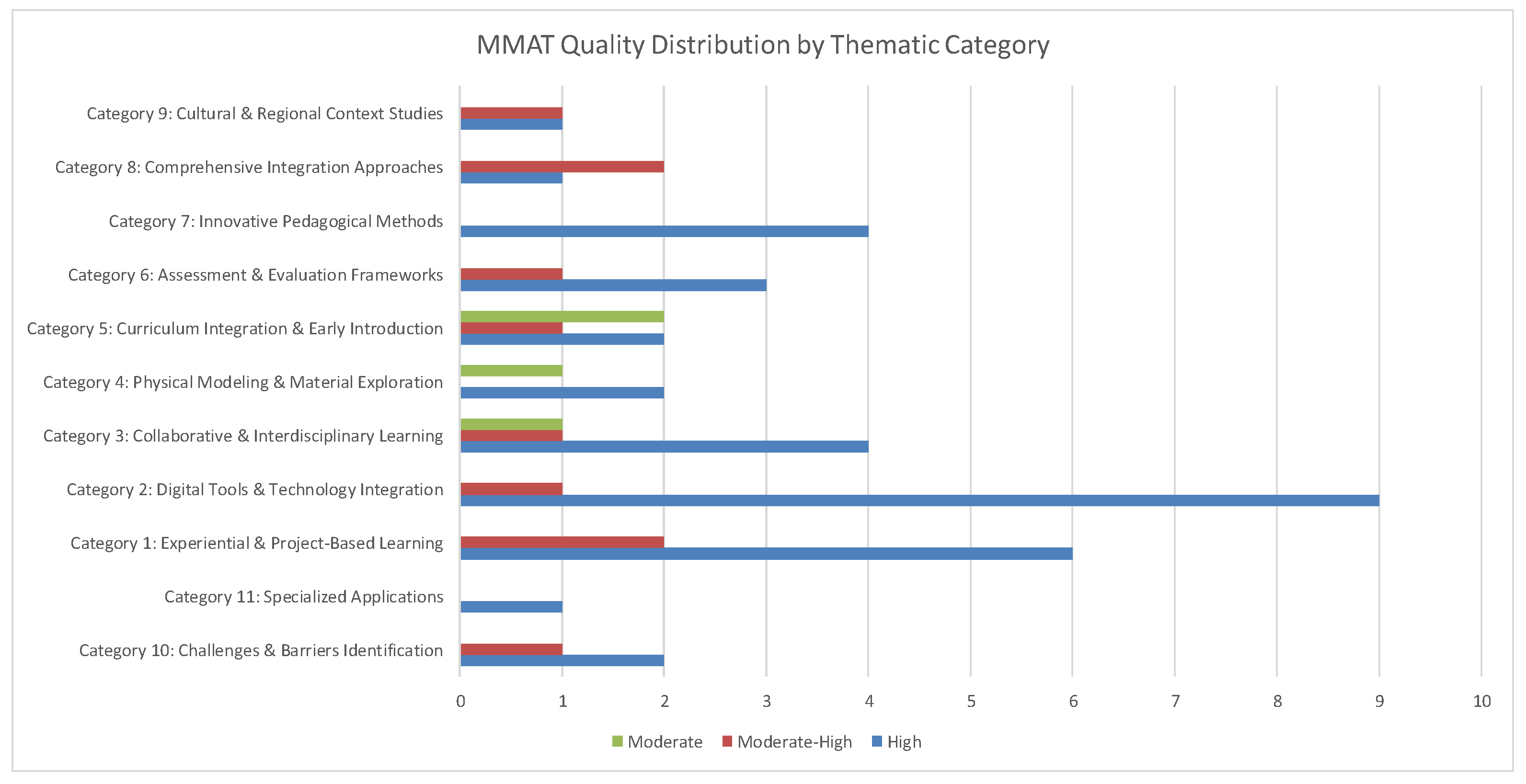 | Methodological Constraints | Many studies employ qualitative or action research methods without rigorous control groups or longitudinal data, which constrains causal inference and weakens the robustness of conclusions regarding pedagogical effectiveness. | [7,8,19,38] |