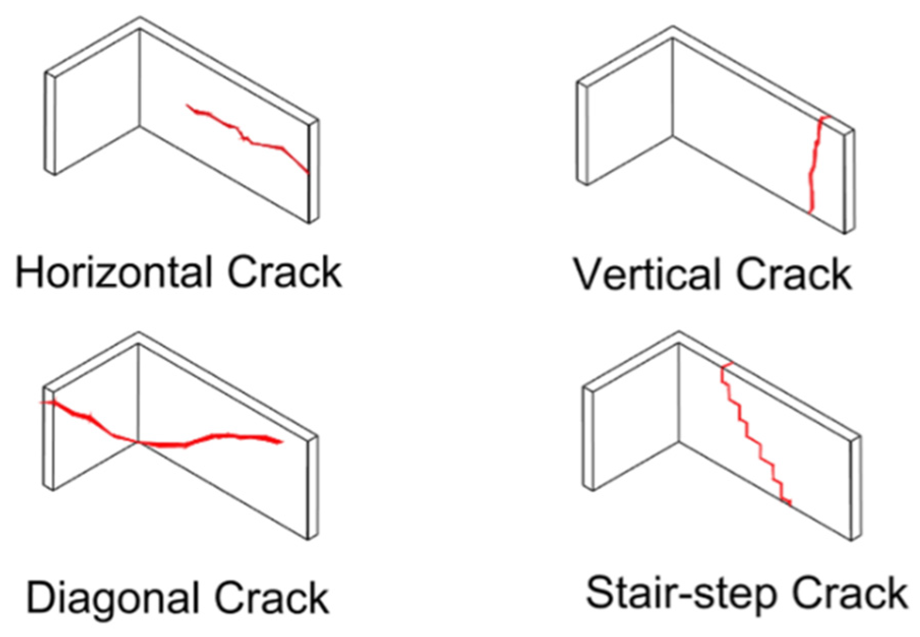 - Lai, J.L.W. Type of Cracks on Buildings. IPM. 24 March 2020. Available online: https://ipm.my/type-of-cracks-on-buildings/ (accessed on 1 August 2025).