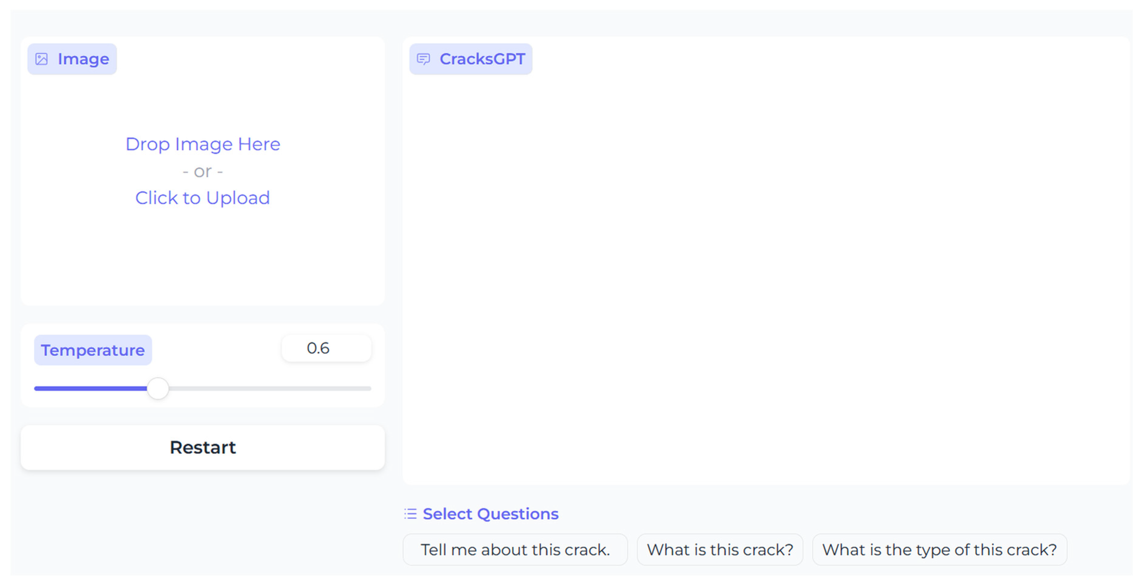 - Wen, Y.; Chen, K. Autonomous detection and assessment of indoor building defects using multimodal learning and GPT. In Proceedings of the Construction Research Congress 2024, Des Moines, IA, USA, 20–23 March 2024; American Society of Civil Engineers: New York, NY, USA, 2024; pp. 1001–1009. [Google Scholar] [CrossRef]