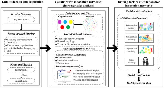 This paper discusses the characteristics of collaborative innovation in GI and its driving factors. Therefore, Figure 1 shows our research framework, which is divided into three parts, including: (1) Data collection and acquisition; (2) Collaborative innovation networks in GI characteristics analysis; and (3) Analysis of driving factors of collaborative innovation in GI.
