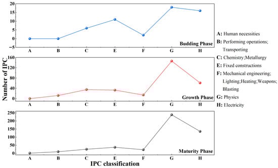 GI’s patents cover a wide range of technical fields, so this article analyzes the fields of collaborative patents for three phases. As can be seen from Figure 3, the technical fields of GI mostly exist in the fields of electricity, physics, and fixed buildings, and exhibit phased characteristics accordingly. During the growth phase, GI has carried out CI in the fields of electricity and physics, showing a gradual upward trend. GI occupies an important position for CI in the field of physics.