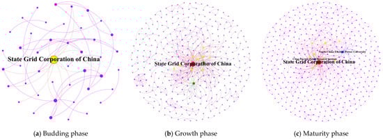 In the budding phase, there were fewer organizations, mainly led by the State Grid Corporation of China. Entering the growth phase, more and more organizations joined. The scale of the network expanded significantly, and the scale of innovation activities and cooperation groups led by the State Grid Corporation continued to expand. At the maturity stage, the network scale continued to expand, showing a rapid development trend. The State Grid Corporation has always occupied a key position, the number of patented inventions at North China Electric Power University has increased significantly, and the diversity of cooperative organizations has further increased.