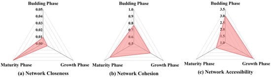 Following parameter estimation, it is essential to assess the validity of the obtained results by conducting a goodness-of-fit evaluation. In this study, three representative statistics—Edge-wise, Dyad-wise, and Degree distribution—were selected to diagnose the model’s fitting performance. The goodness-of-fit plots for the three phases are summarized in Figure 7. The solid black line represents the distribution of network statistics derived from the observed network, while the gray area denotes the corresponding confidence interval from the fitted network. As illustrated in Figure 6, the black line falls within the confidence interval of the fitted network, indicating that our model exhibits relatively strong robustness.