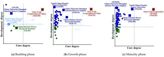 In the maturity phase (Table 2c), the “State Grid Corporation of China” continues to maintain its core, intermediary, and leading role. The importance of universities and research institutions has gradually emerged, among which “North China Electric Power University”, because of its rich resources, has become the intermediary and bridge of technological innovation and information exchange, and plays the role of innovation dominator and central actor in CI, promoting technological innovation.