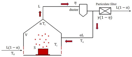 The schematic diagram of the circulating ventilation system for controlled environment air temperature calculation is shown in Figure 2, where L is the air volume of local exhaust hood, m3/s; α is the proportion of circulating air; To is the temperature outside the controlled environment, K; t is the time, s; S is the intensity of the heat source, W; is the emission proportion (the ratio of the intermittent emission time of the pollution source to the total time, which includes both emission and non-emission periods); Ta is the return air temperature of the circulating ventilation system, K; Ti is the temperature within the controlled environment, K; n is the unevenness coefficient of air temperature (the ratio of the temperature at the exhaust outlet to the average temperature of the controlled environment); and V is the volume of the controlled environment space, m3. The red arrow in Figure 1 represents the direction of high-temperature air flow.