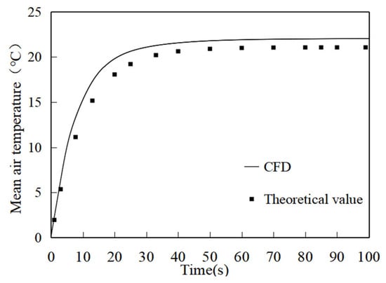 In numerical simulation, the mean air temperature in the environment controlled by the circulating ventilation system shown in Figure 2 is calculated with a circulating air ratio α = 15%. The heat source had an emission intensity of 500 W/m2, and the theoretical value of the mean air temperature was calculated by substituting α = 15% into Equation (8). The comparison between theoretical and simulated values is shown in Figure 6. As can be seen from Figure 6, as the release time of particulate matter increases, the mean air temperature in the controlled environment gradually increases and ultimately plateaus. Similarly to the accumulation of pollutants, there is also an upper limit for temperature accumulation. Specifically, the mean air temperature in the controlled environment reached a relatively stable level within 30 s of particle release, and the limit value was 20.75 °C.