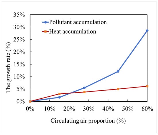 The growth rates of pollutant and thermal accumulation under different circulating air proportions.