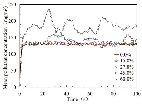 Figure 9 shows the real-time change in the mean pollutant concentration in the controlled environment over time under different circulating air proportions. With the increase in the proportion of circulating air, the real-time mean pollutant concentration also increases. Under a constant circulating air proportion, the mean pollutant concentration rises with extended release time and finally equilibrates. That is to say, there is an upper concentration limit for pollutant accumulation. There is no significant difference between the mean pollutant concentration with α = 0% and that with α = 15% and α = 27.8%. This shows that the proportion of circulating air is within a certain range and does not lead to substantial pollutant accumulation. At the same time, the real-time emissions of pollutants are effectively reduced and the amount of fresh air is reduced.