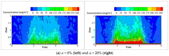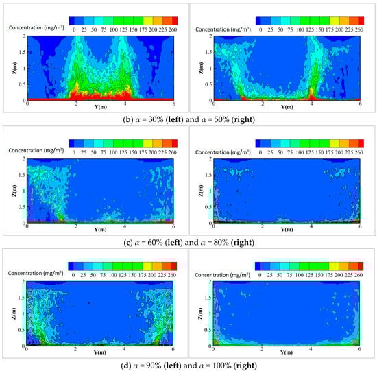 The DPM concentration of pollutants at the same cross-section X = 1.5 m under different circulating air proportions is shown in Figure 12a–d. Comparison shows that the pollutant emanation primarily concentrates around the source, exhibiting upward smoke-like dispersion. Pollutant concentration demonstrates an inverse distance relationship—highest near the source and decreasing with distance. Without circulating ventilation, pollutants remain localized and complete spatial dispersion occurs at 20% circulating air proportion. As shown in Figure 12, under ventilation without the circulating system (α = 0%), pollutant dispersion is more concentrated in the middle of the room, and high-temperature particulate matter migrate towards the local exhaust hood vent. The concentration gradient of pollutants decreases with increasing height, with the maximum value located near the pollution source.