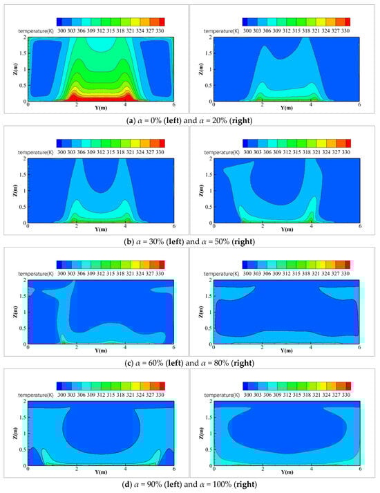 Figure 13 displays the temperature distribution at plane X = 1.5 m (source strength: 35 mg/s, heat source temperature: 473.15 K). When the circulating air proportion reaches 60% or higher, the temperature decay in the airflow field accelerates due to enhanced air recirculation. At lower proportions, air temperature outside the pollution source remains stable at 300–303 K. When the circulating air proportion increases to 80%, the temperature gradient around the pollution source begins to basically disappear, and when the proportion of the circulating air proportion is increased to 100%, the temperatures at the bottom reach 306–309 K.