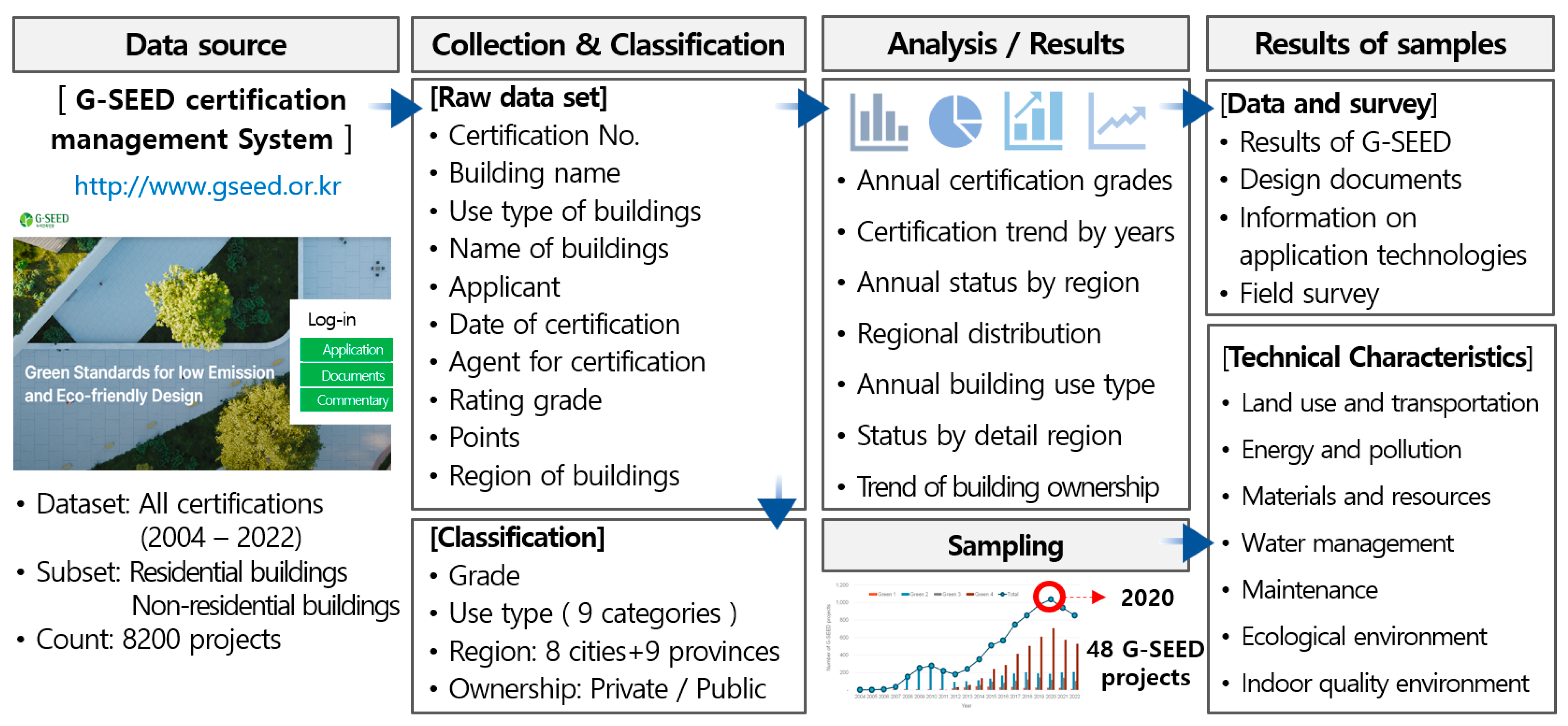 - Based on sample buildings, this study provided technology list used to evaluate G-SEED-certified buildings as green buildings. The most commonly adopted technical features included the use of public transportation (such as buses and bicycles), energy efficiency technologies, eco-friendly materials, water-saving appliances, operational manuals, and ventilation systems with heat recovery and air temperature control. This paper could help architects, building owners, and researchers in gaining a comprehensive understanding of G-SEED. Readers can understand the technical level of green buildings through this study.