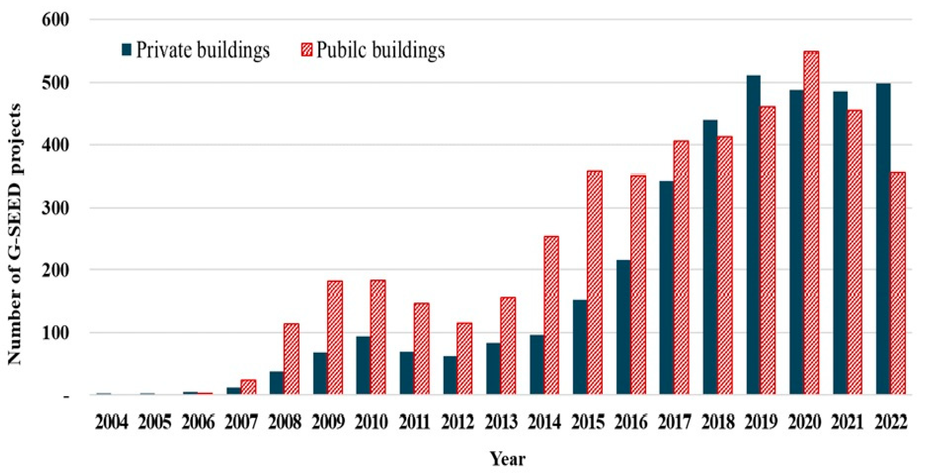 - Among the buildings certified in South Korea from 2004 to 2022, 50% received a Green 4 grade, the highest proportion. In order to increase the sustainability of the project and achieve GHG emission reduction, it is necessary to design buildings that aim for Green 2 grade or higher. For public buildings, it is mandatory to obtain Green 2 grade certification through G-SEED evaluation [11]. On the other hand, private buildings are voluntarily certified. For this reason, in order to strengthen the role of G-SEED in promoting green buildings in the private real estate market, the Korean government and the managing authority of the certification system should continuously improve G-SEED. Various measures, such as incentives and tax exemptions, should be continuously proposed to accelerate green building in private construction companies.