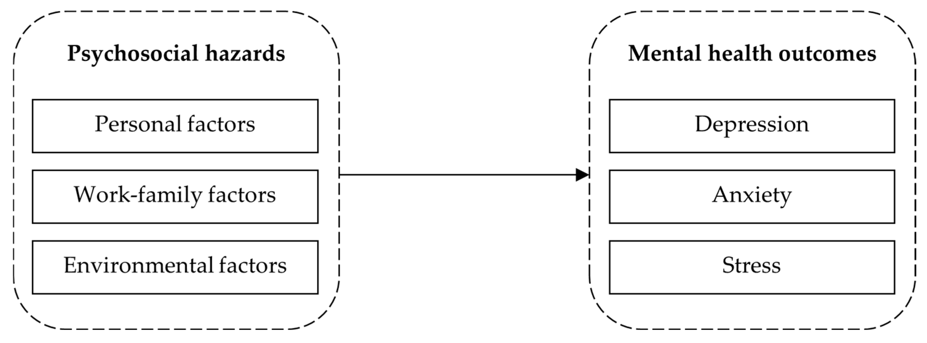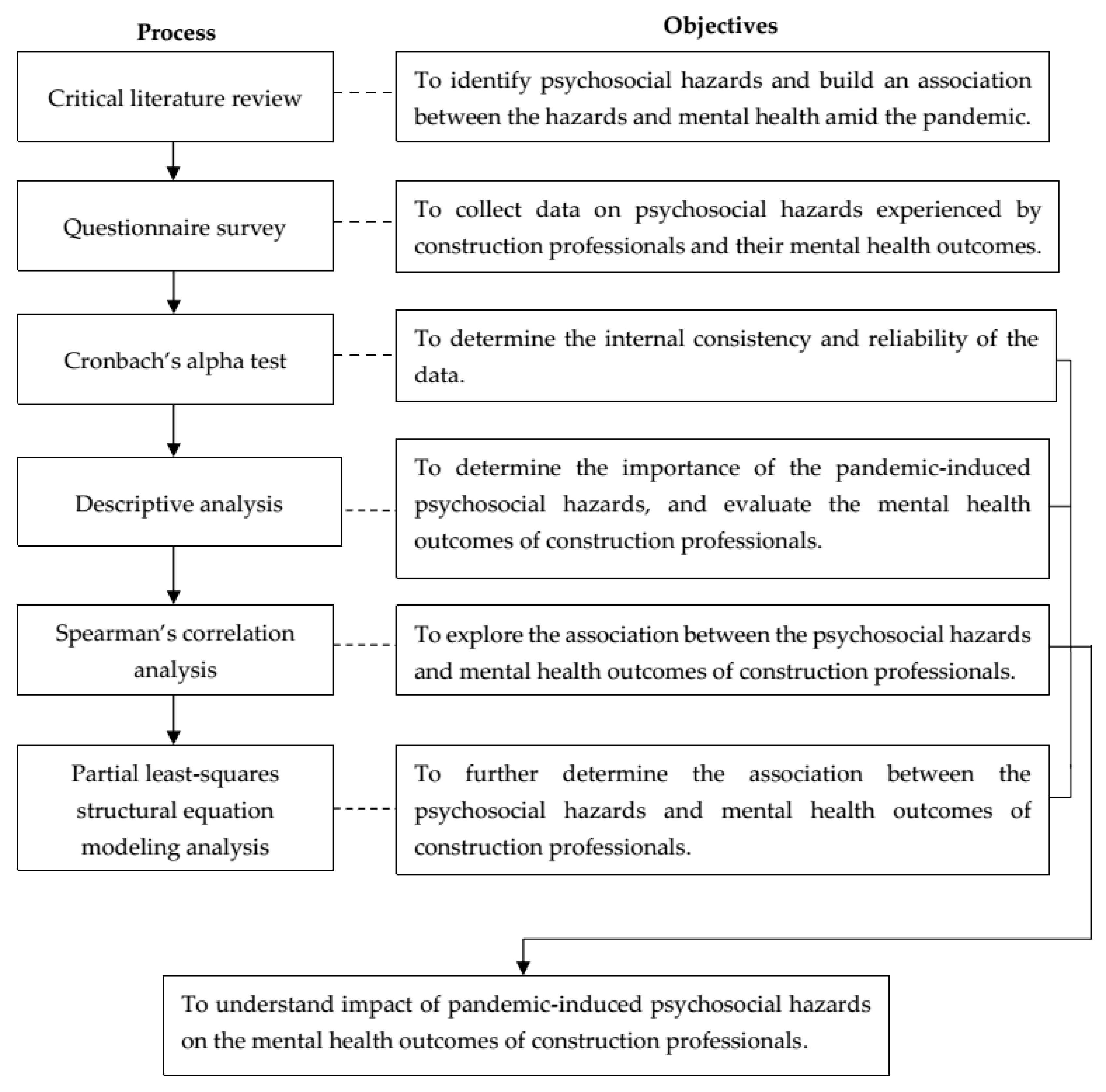 The mental health of construction professionals in China has received little attention despite the tremendous size of the industry and its significant impact on national and international socioeconomic developments [12]. In 2023, for instance, the Chinese construction industry employed more than 50.43 million people [22], and its total output value was more than RMB 32.65 trillion [23]. Furthermore, previous studies have overlooked research on psychosocial hazards and their impacts on the mental health outcomes of construction professionals during the COVID-19 pandemic period. In this research, therefore, these two problems have been integrated to investigate the pandemic-induced psychosocial hazards experienced by professionals working in the Chinese construction industry and the impact of those hazards on their mental health outcomes. This is significant because these professionals manage site-based activities, which were prone to experiencing disruptions and specific psychosocial hazards due to the pandemic. Furthermore, identifying pandemic-induced psychosocial hazards and their influence on mental health is important to improving the readiness of the construction industry in facing future emergencies and protecting the well-being of construction professionals. This effort ensures the resilience of the construction industry, an important industry that has a considerable influence on the socioeconomic stability and development of a nation. To achieve this aim, the objectives of the research are to (1) identify the critical pandemic-induced psychosocial hazards among construction professionals in China; (2) evaluate the mental health conditions of these professionals during the pandemic; and (3) explore the impacts of pandemic-induced psychosocial hazards on their mental health outcomes during the pandemic.