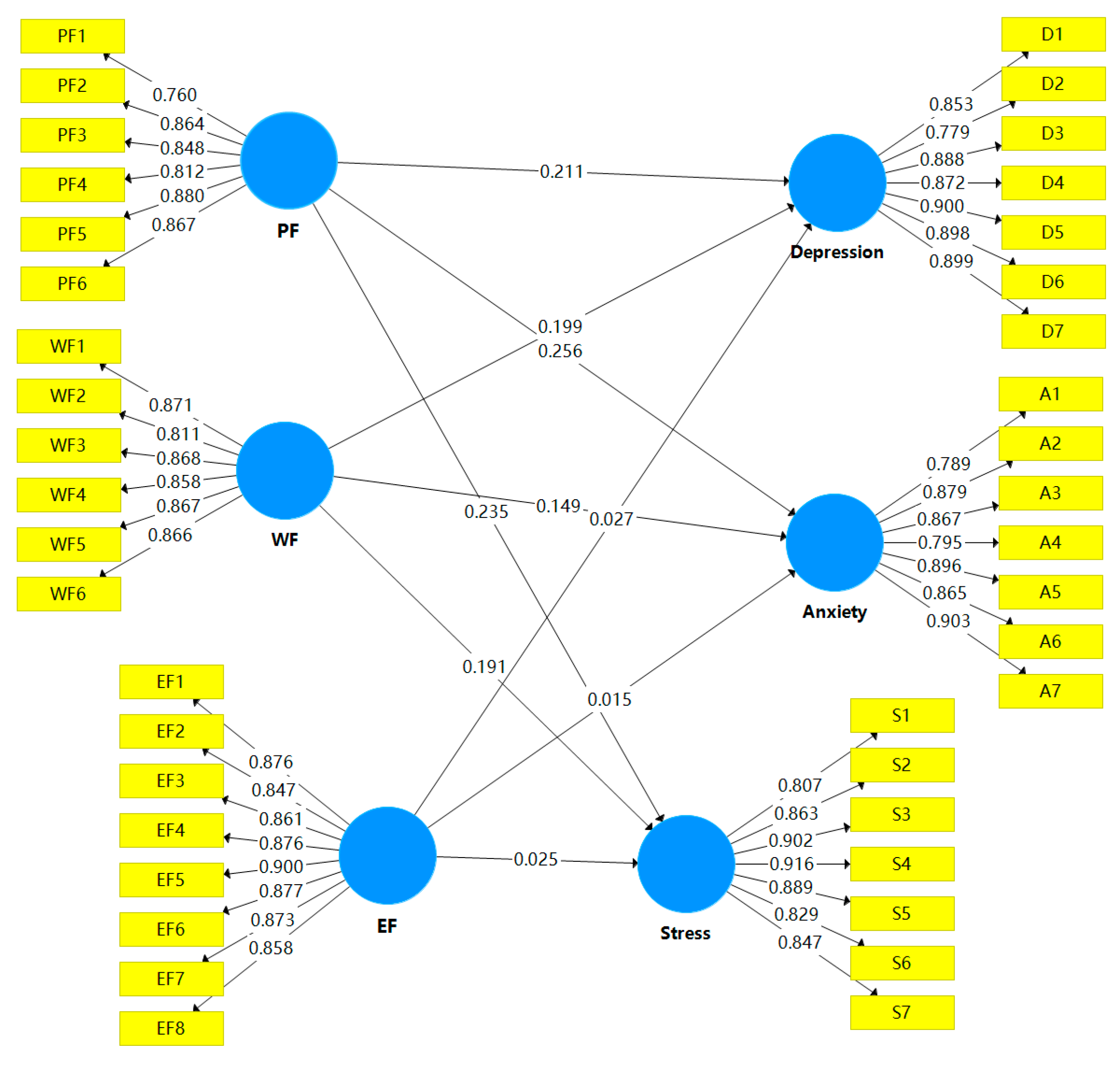 Figure 3 indicates that among the three dimensions, personal factors were the leading psychosocial hazards that significantly influenced the mental health of these professionals during the pandemic. In addition, personal factors have a stronger influence on anxiety (path coefficient = 0.256, p = 0.000) than stress (path coefficient = 0.235, p = 0.000) and depression (path coefficient = 0.211, p = 0.002), while work–family-related factors have more serious impacts on depression (path coefficient = 0.199, p = 0.004) than anxiety (path coefficient = 0.149, p = 0.018) and stress (path coefficient = 0.191, p = 0.004). Environmental factors do not have strong impacts on mental health, as the coefficients are low, ranging from 0.015 to 0.027, and the levels are not significant.