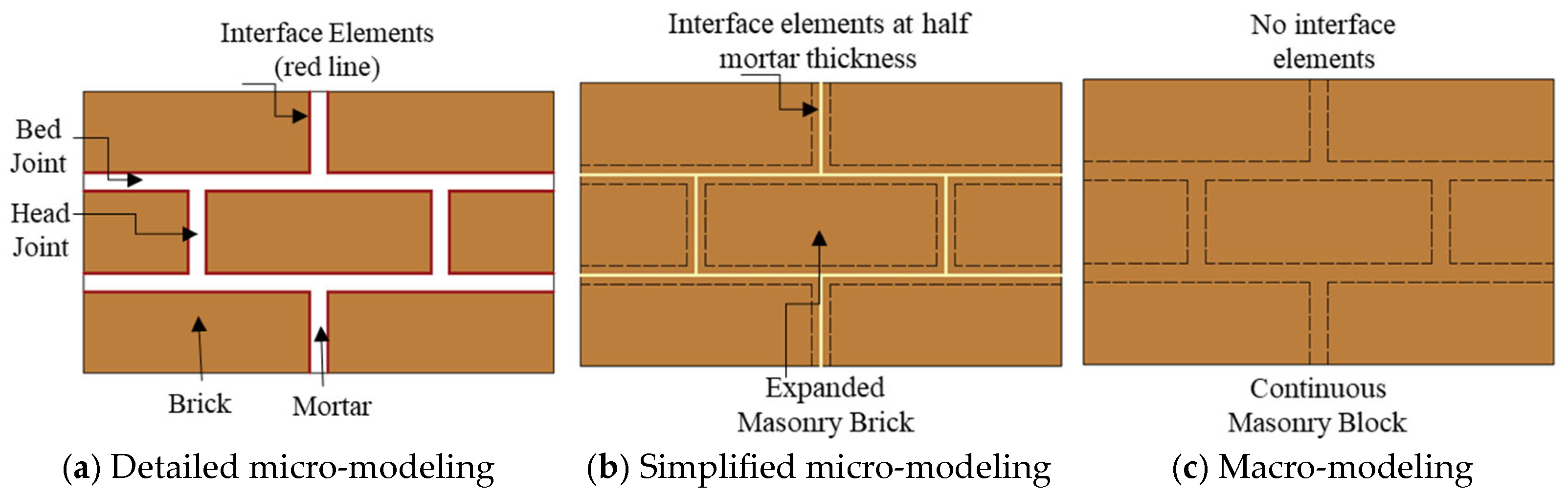 - Annecchiarico, M.; Portioli, F.; Landolfo, R. Micro and Macro-Finite Element Modeling of Brick Masonry Panels Subject to Lateral Loadings. Available online: https://www.researchgate.net/publication/289195463_Micro_and_macro-finite_element_modeling_of_brick_masonry_panels_subject_to_lateral_loadings (accessed on 5 November 2023).