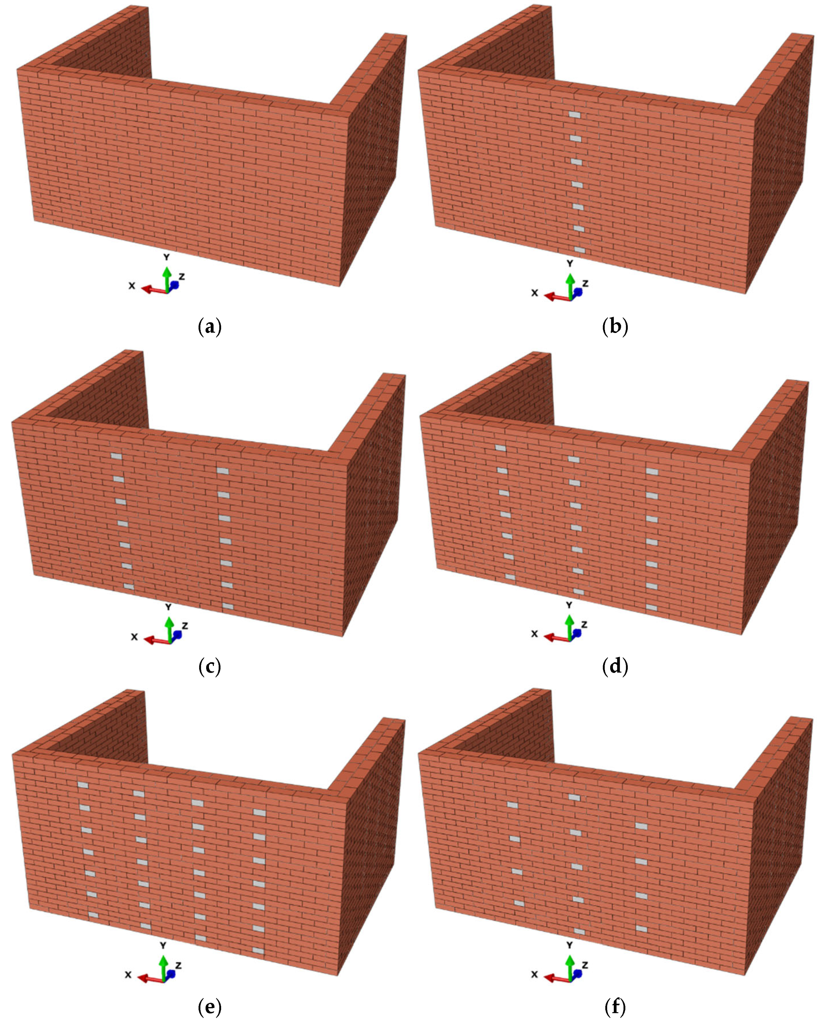- Moradi, N.; Yazdani, M.; Janbozorgi, F.; Hashemi, S.J. In-Plane Seismic Performance of Historical Masonry Walls with Various Brick Bond Patterns Using Micro-Modeling Approach. Asian J. Civ. Eng. 2024, 25, 4863–4876. [Google Scholar] [CrossRef]