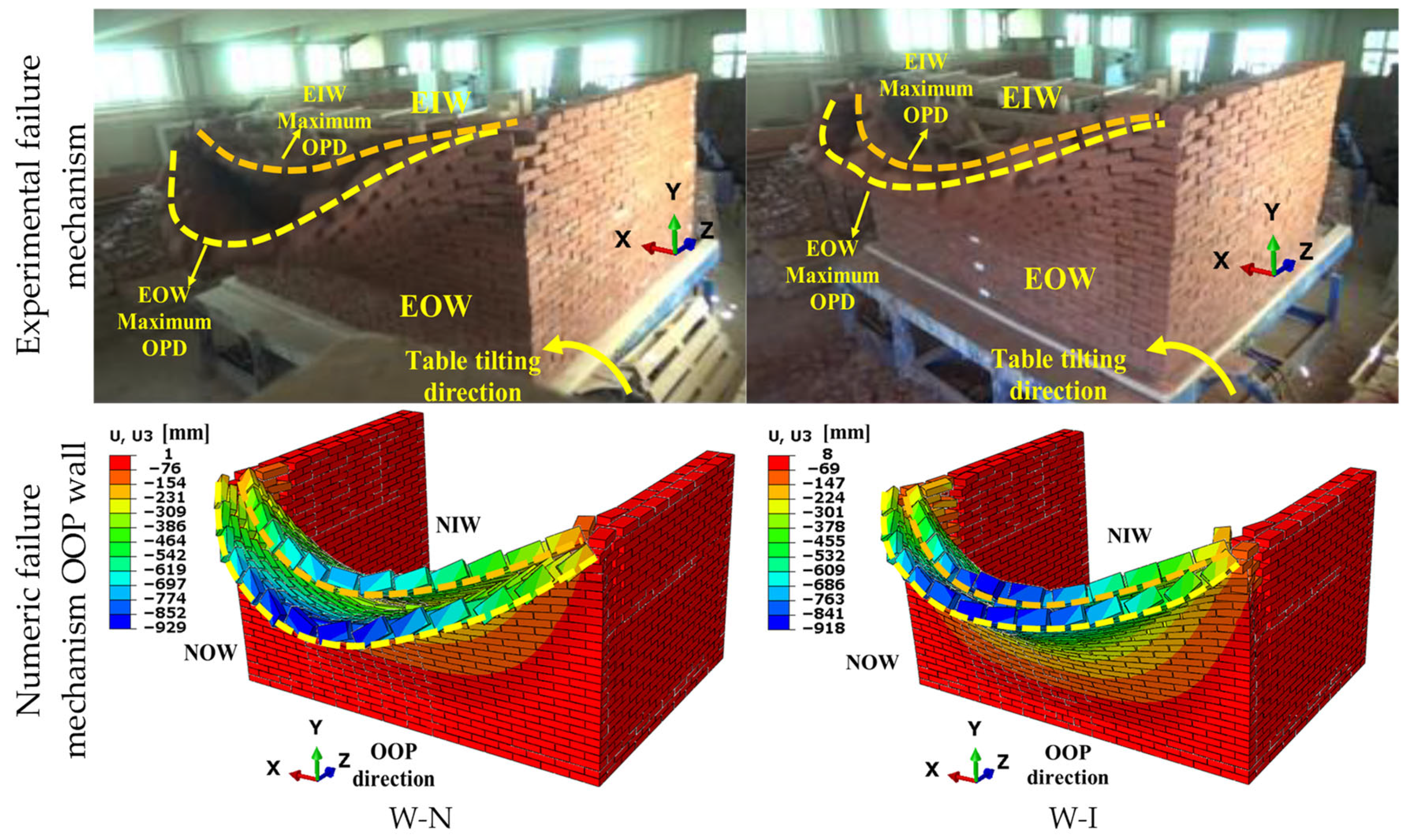 - Kıpçak, F.; Erdil, B. Yığma Yapıların Düzlem Dışı Davranışlarına Yan Duvarın ve Yan Duvar Boşluğunun Etkisi. Niğde Ömer Halisdemir Üniversitesi Mühendislik Bilim. Derg. 2023, 12, 853–860. [Google Scholar] [CrossRef]