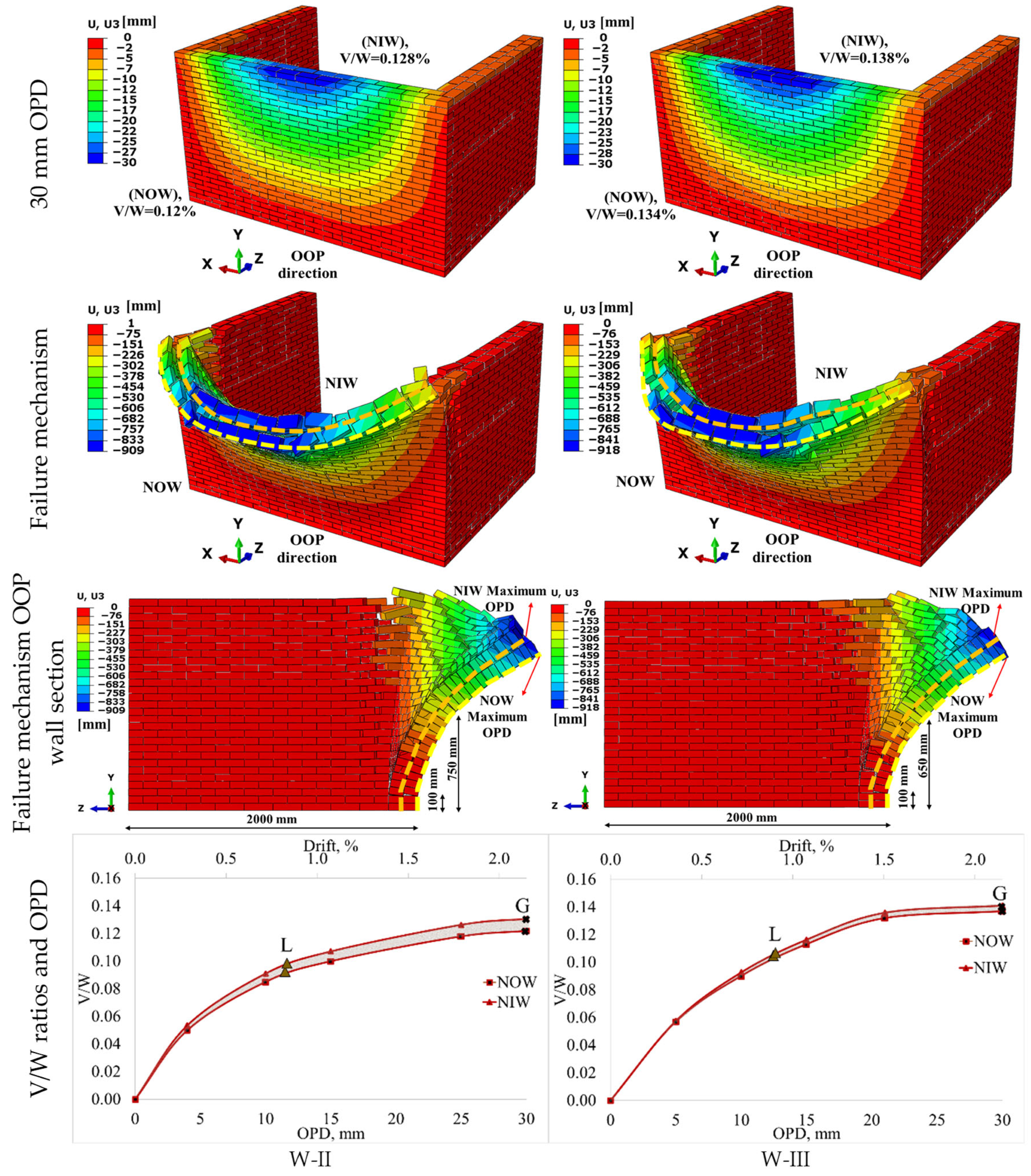 - As the vertical rows of header bricks increased, enhanced out-of-plane behavior was attained, and higher V/W ratios were reached. This situation reveals that the capacity of the structure is directly related not only to the number of existing header bricks but also to their regular arrangement.