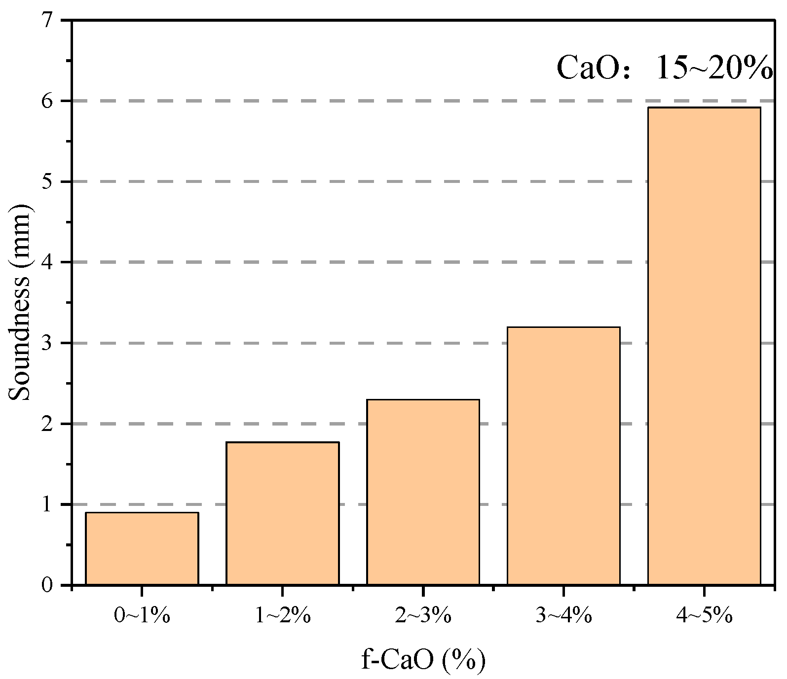 f-CaO has the most significant impact on the stability of fly ash, and C-class fly ash is consequently restricted in hydraulic concrete applications due to its higher f-CaO content. Free CaO (f-CaO) has the most significant impact on the stability of fly ash, and C-class fly ash is consequently restricted in hydraulic concrete applications due to its higher f-CaO content. In Figure 1, when f-CaO content increases from 0–1% to 4–5%, the Le Chatelier expansion value rises by 5.0 mm, with the maximum increment (2.72 mm) occurring during the transition from 3–4% to 4–5% f-CaO. At 4–5% f-CaO content in C-class fly ash, the Le Chatelier expansion value reaches 5.92 mm, exceeding the stability limit specified in GB/T 1596-2017 (expansion value ≤ 5 mm).