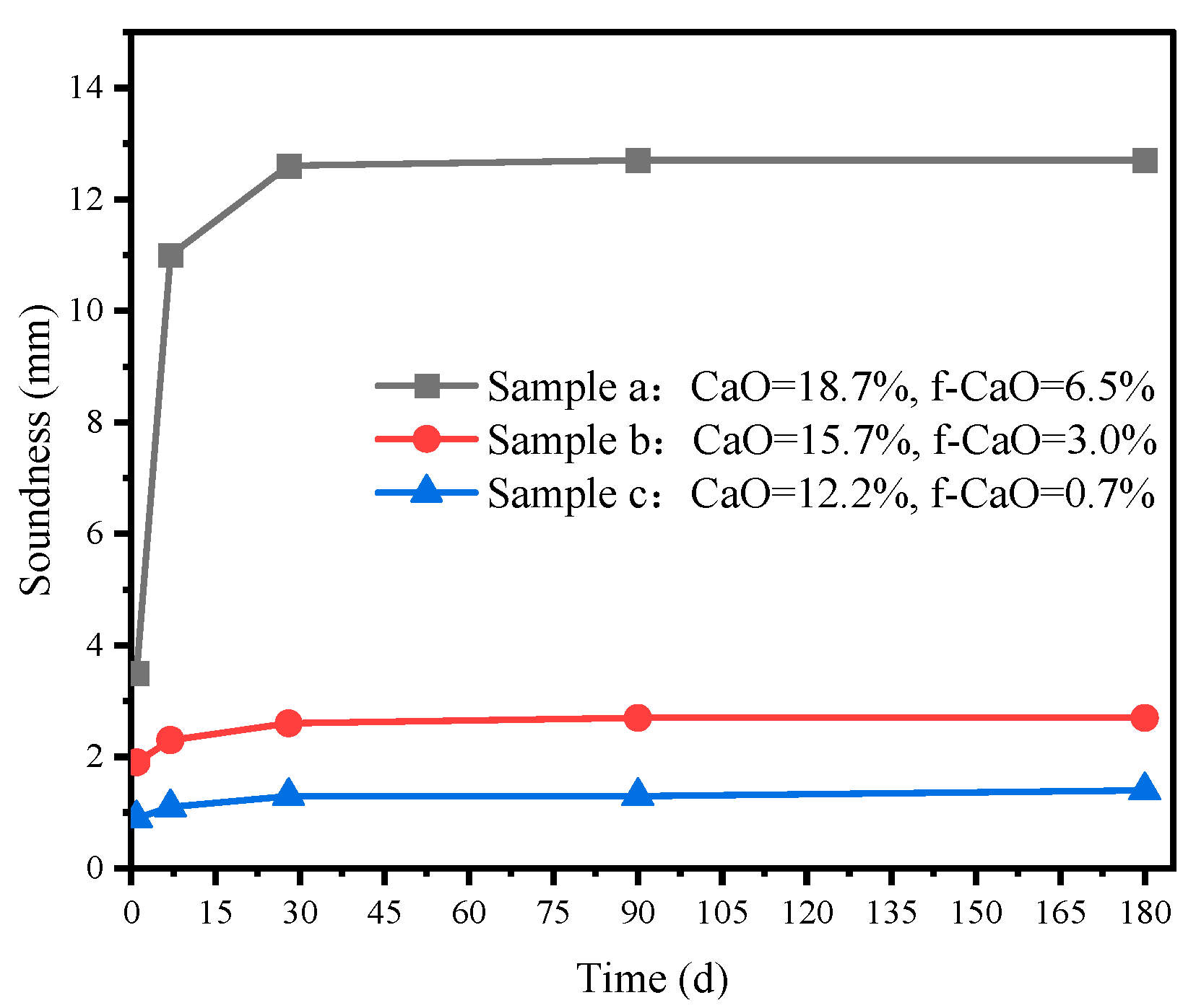 Fly ash samples with varying CaO and f-CaO contents were selected: a (18.7% CaO, 6.5% f-CaO), b (15.7% CaO, 3.0% f-CaO), and c (12.2% CaO, 0.7% f-CaO). These were mixed with cement at a mass ratio of 3:7 and a water-cement ratio of 0.4 to prepare the cementitious paste. The specimens were molded in Le Chatelier molds and subjected to standard curing from 0 to 180 days. The stability variations are shown in Figure 2. As shown, the Le Chatelier expansion values of all specimens increased with curing age, but the expansion rates varied across different periods, which can be divided into three stages: (1) Rapid expansion stage (1–7 days): characterized by high expansion rates and rapid value increase; (2) Deceleration stage (7–28 days): marked by reduced expansion rates and slowed value growth; (3) Stabilization stage (28–180 days): exhibiting minimal expansion rates and nearly constant volume. Taking sample a as an example, the Le Chatelier expansion values at 1, 7, 28, 90, and 180 days were 3.5 mm, 11.0 mm, 12.6 mm, 12.7 mm, and 12.7 mm, respectively. The average expansion rates were 1.25 mm/day during 1–7 days, 0.08 mm/day during 7–28 days, and nearly 0 mm/day during 28–180 days. At identical curing ages, higher f-CaO content in fly ash led to progressively greater Le Chatelier expansion values. At 28 days, sample a exhibited a 10 mm increase compared to sample b, failing the stability standard, whereas the increase was only 1.3 mm compared to sample c, maintaining acceptable stability.