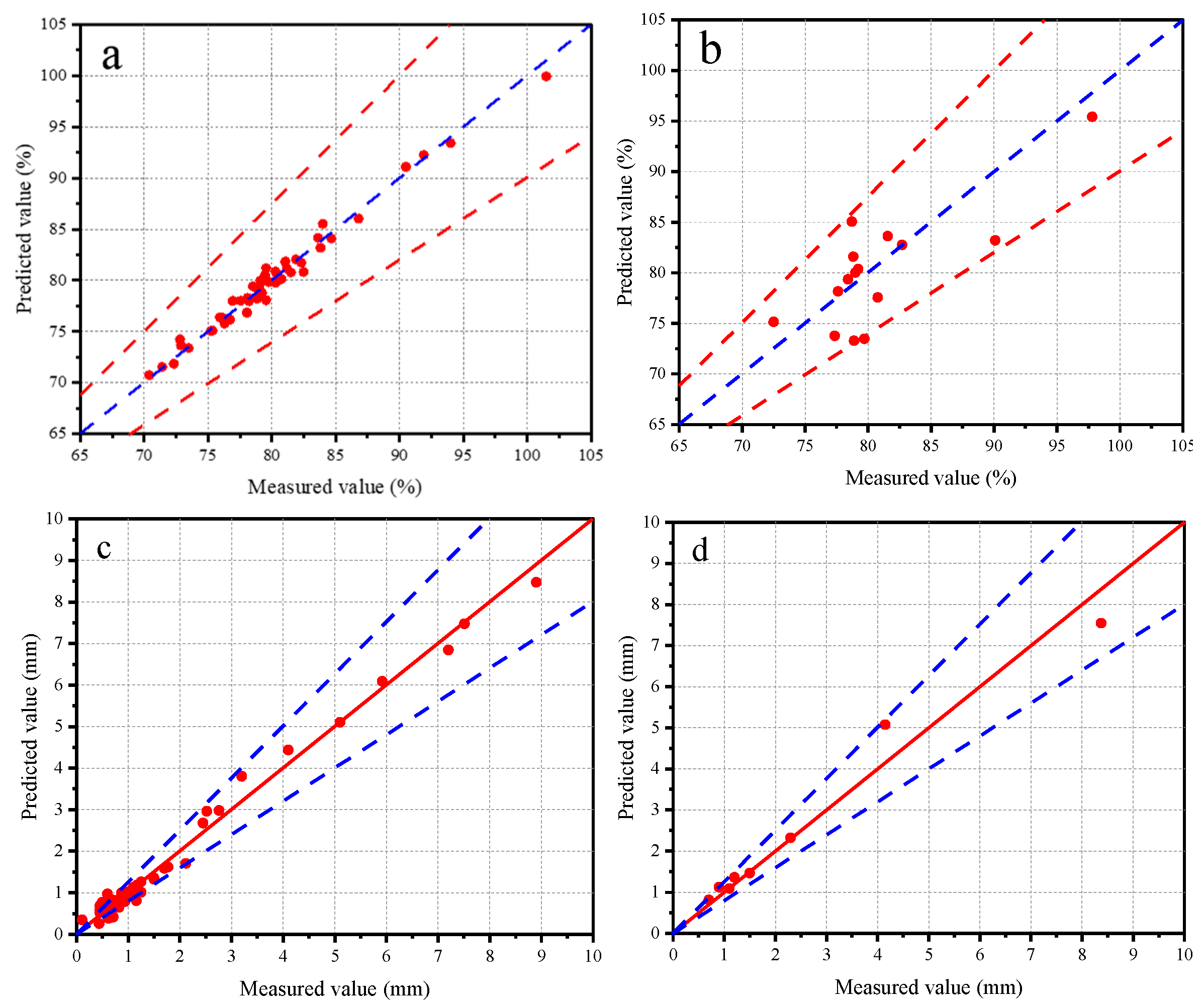 Figure 6 shows the comparison between the predicted and measured values of the strength activity index and soundness based on the PPR model. As can be seen from the figure, when the relative error |δ| between the predicted and measured values of the strength activity index for the modeling and validation samples is ≤10%, the pass rates for the modeling and validation samples reach 100% and 93.8%, respectively. For soundness, when the relative error |δ| between the predicted and measured values for the modeling and validation samples is ≤20%, the pass rates for the modeling and validation samples reach 78.3% and 75.0%, respectively. The pass rates for the modeling samples and the reserved validation samples are reduced.