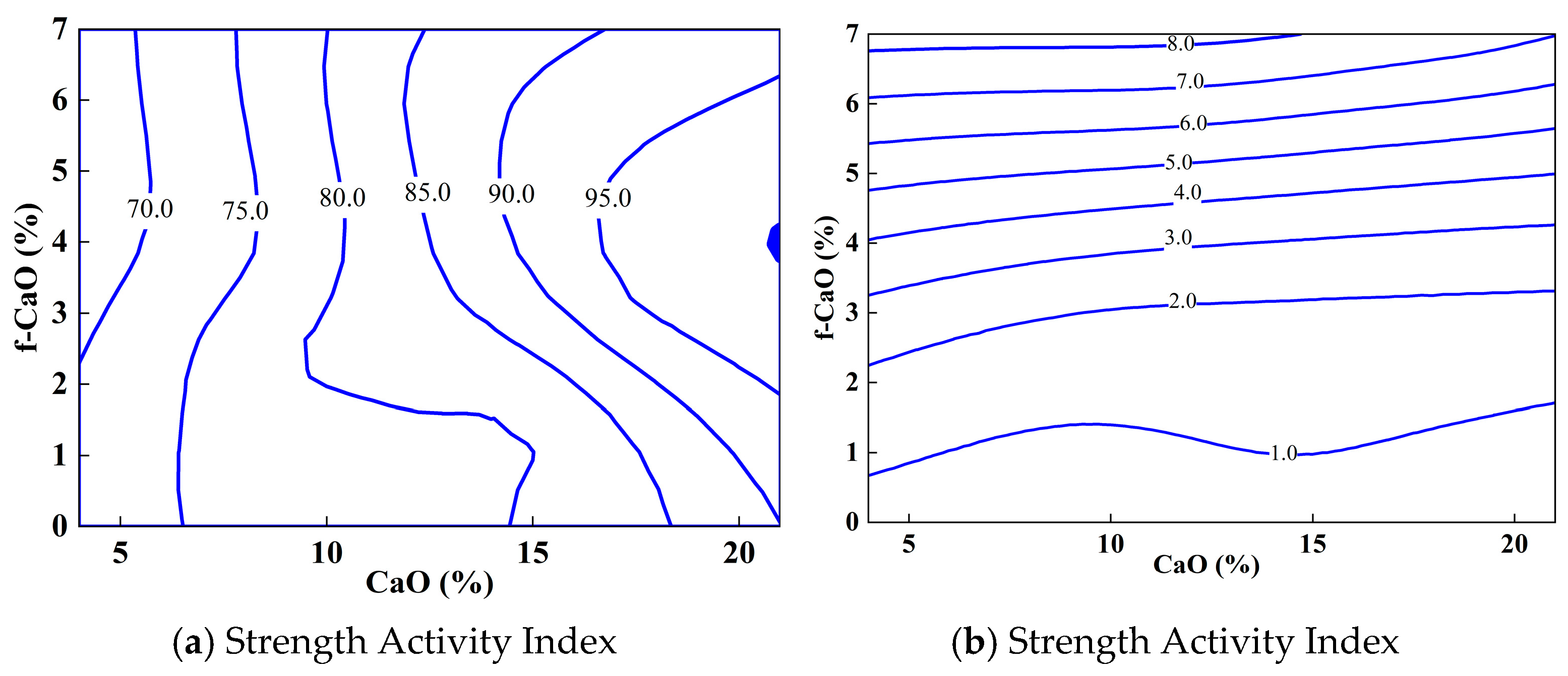 Taking an engineering project as an example, when local Class F fly ash supply is insufficient, partial replacement with Class C fly ash is necessary, provided that the strength activity index meets or exceeds 70% and stability criteria are satisfied. As indicated by the contour plot of fly ash stability and strength activity index (Figure 8) in prior research, stability is primarily influenced by f-CaO content, with volumetric expansion increasing proportionally [32]. In contrast, the strength activity index is predominantly governed by CaO content, showing positive correlation. When fly ash CaO content exceeds 5%, the strength activity index requirement is met, whereas f-CaO content must be ≤4.82% to satisfy stability criteria. Therefore, fly ash with ≥5% CaO and ≤4.82% f-CaO is recommended for optimal performance.