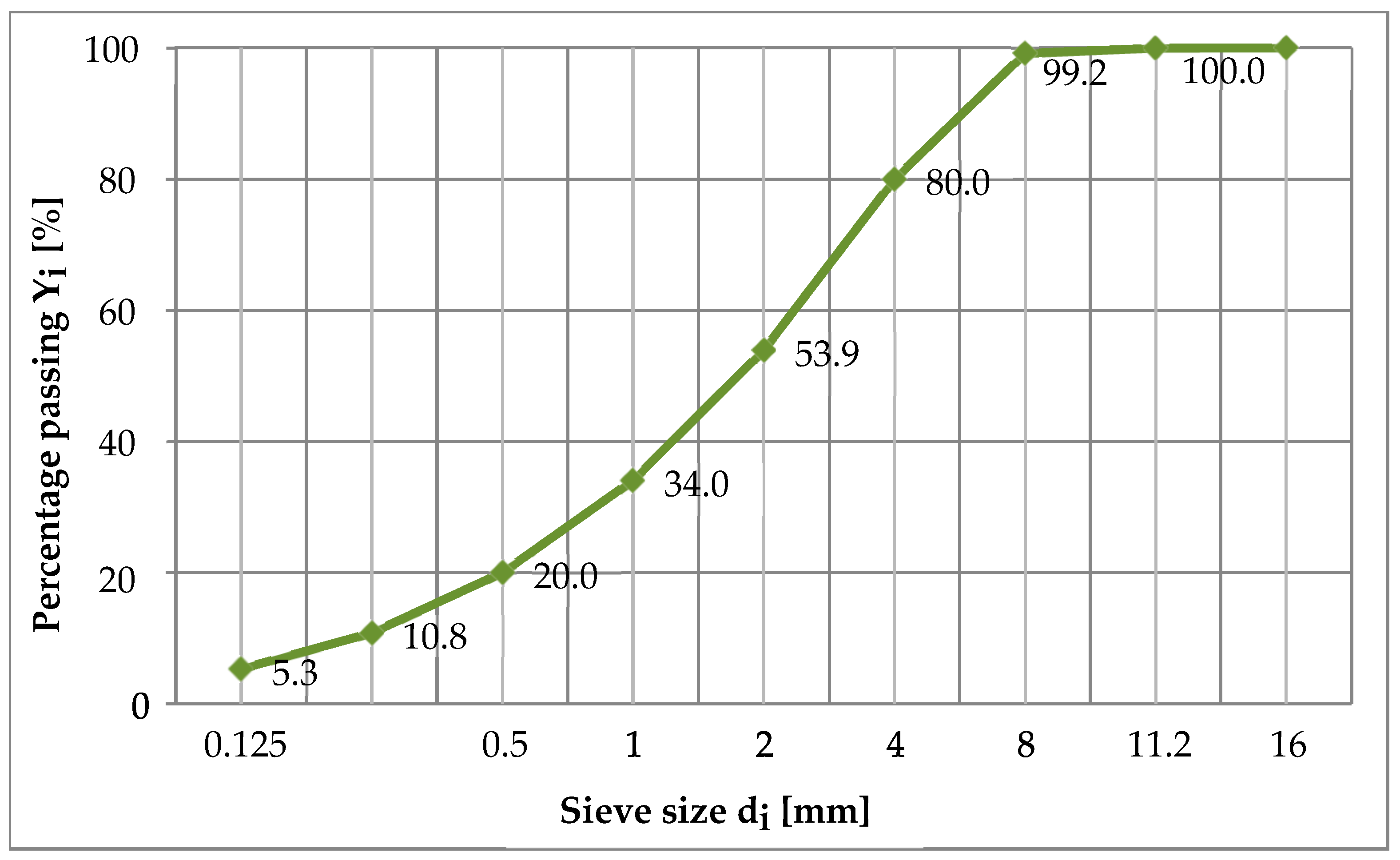 Natural aggregates were tested for key physical properties to ensure their suitability for concrete production. The particle size distribution was determined by dry and wet sieving methods in accordance with EN 933-1 and EN 933-8 [