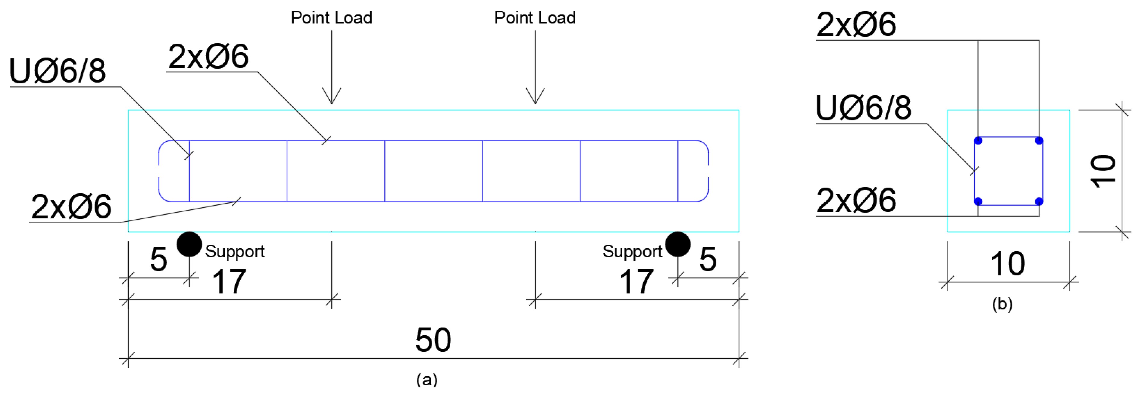 The concrete beams were reinforced with 6 mm diameter ribbed steel bars, arranged with two bars at the bottom and two at the top, while 6 mm stirrups were spaced at 80 mm along the beam length. The reinforcement configuration and loading setup are illustrated in