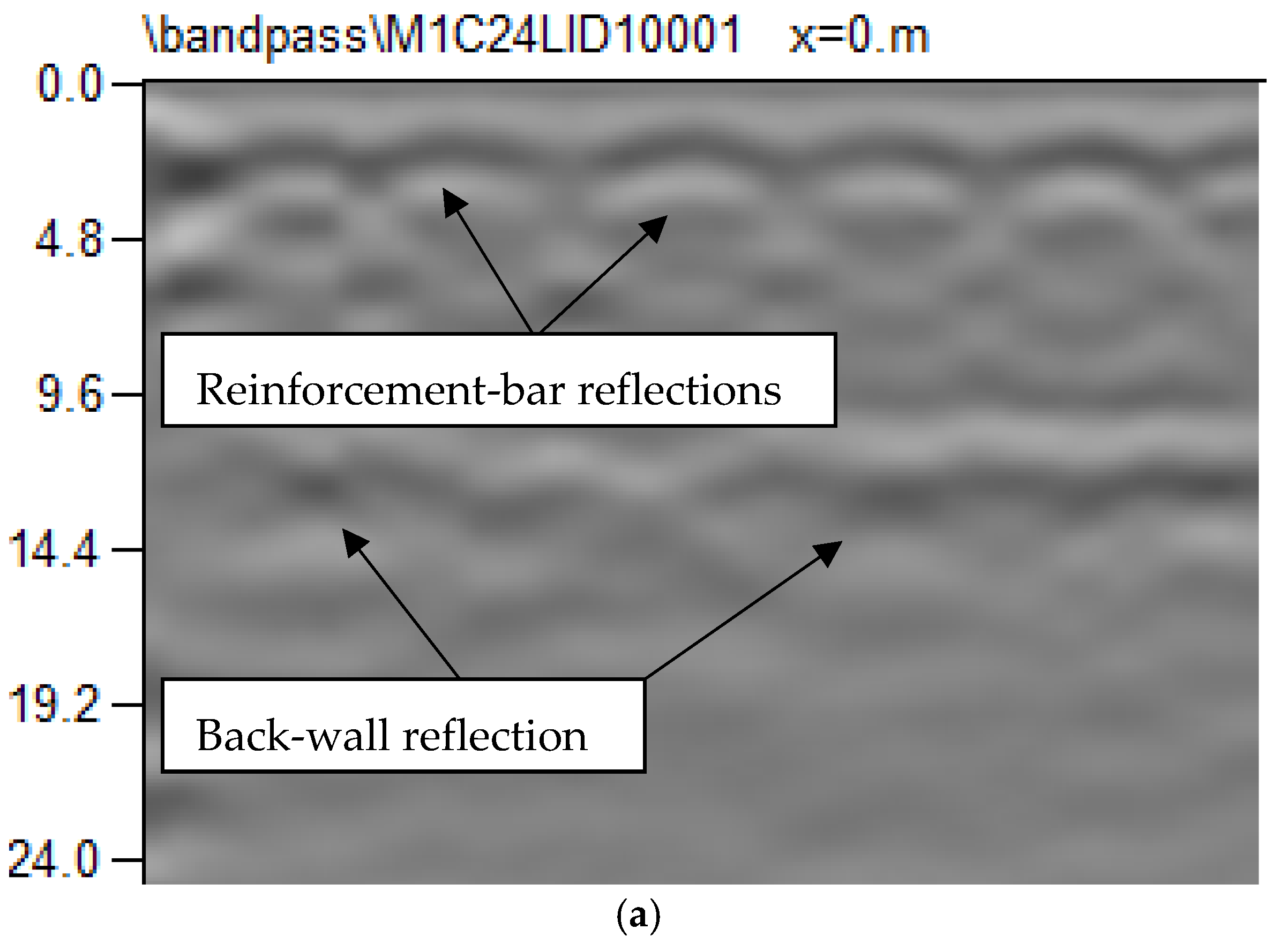 Ground-penetrating radar (GPR) measurements were conducted on all reinforced concrete beams to evaluate their internal structure and dielectric properties. Two antenna frequencies (2 GHz and 3 GHz) were used, providing high-resolution radargrams that revealed consistent reflector patterns corresponding to the embedded reinforcement and layer boundaries. Signal processing included band-pass filtering, background removal, whitening, and Hilbert envelope analysis, which significantly improved reflector contrast and identification.