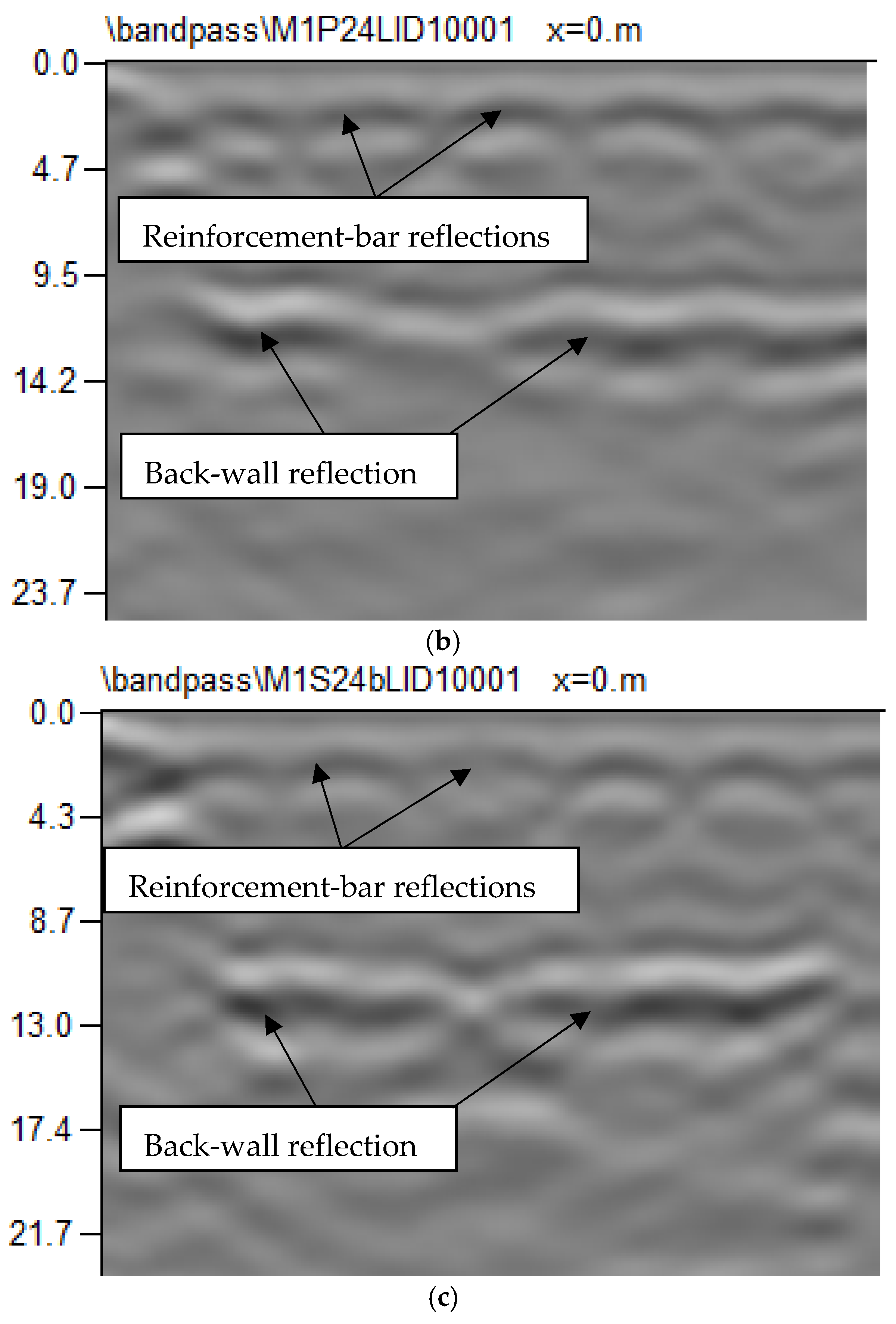Figure 5a–c show representative processed B-scans for the C, P, and S series, respectively, with annotated reinforcement-bar reflections and major layer interfaces.
