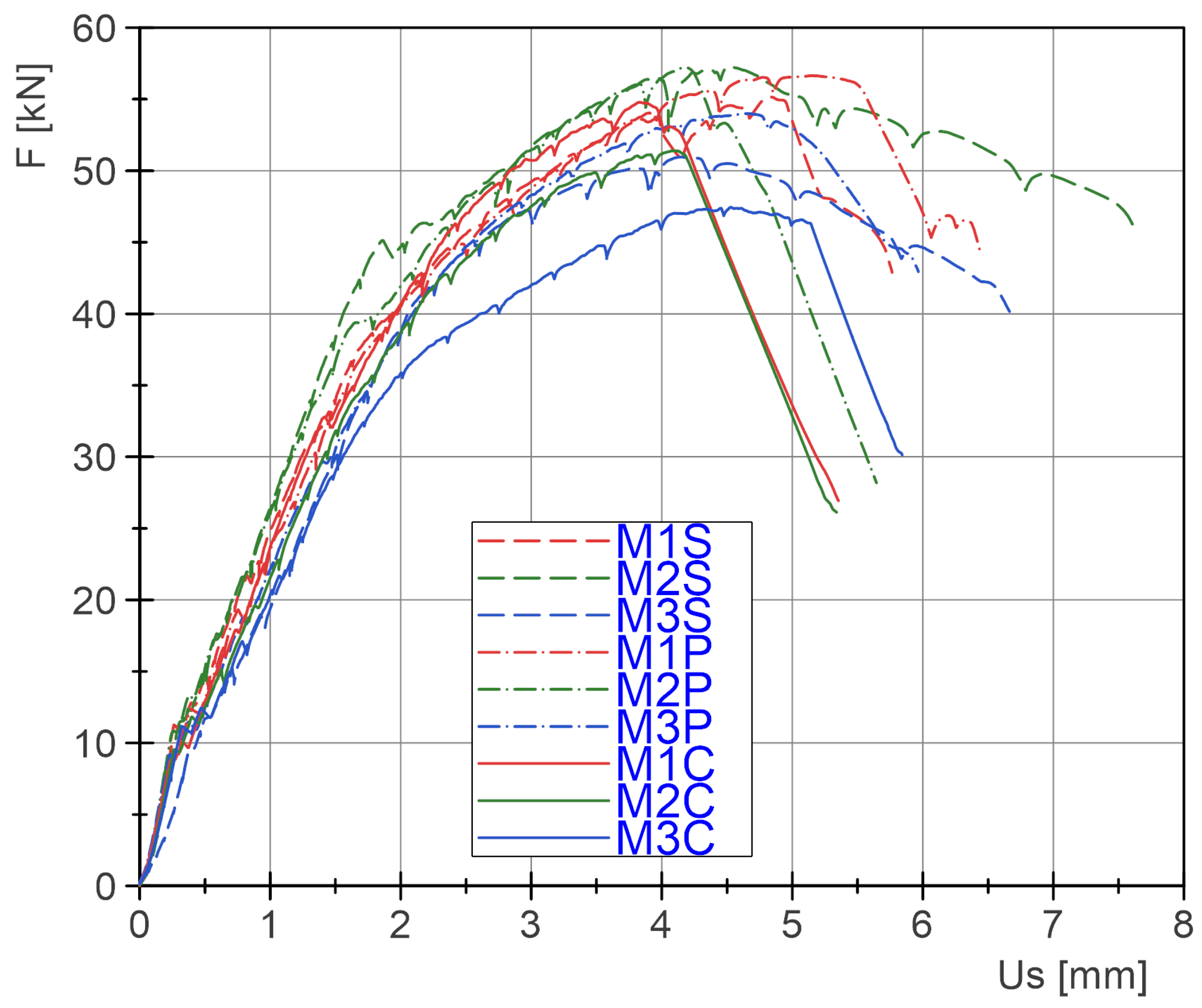 per shear span. This value exceeds the maximum applied shear at the loading points (≈29 kN for the highest recorded peak load), confirming that the specimens were shear-safe and that the tests were governed by flexural behavior.