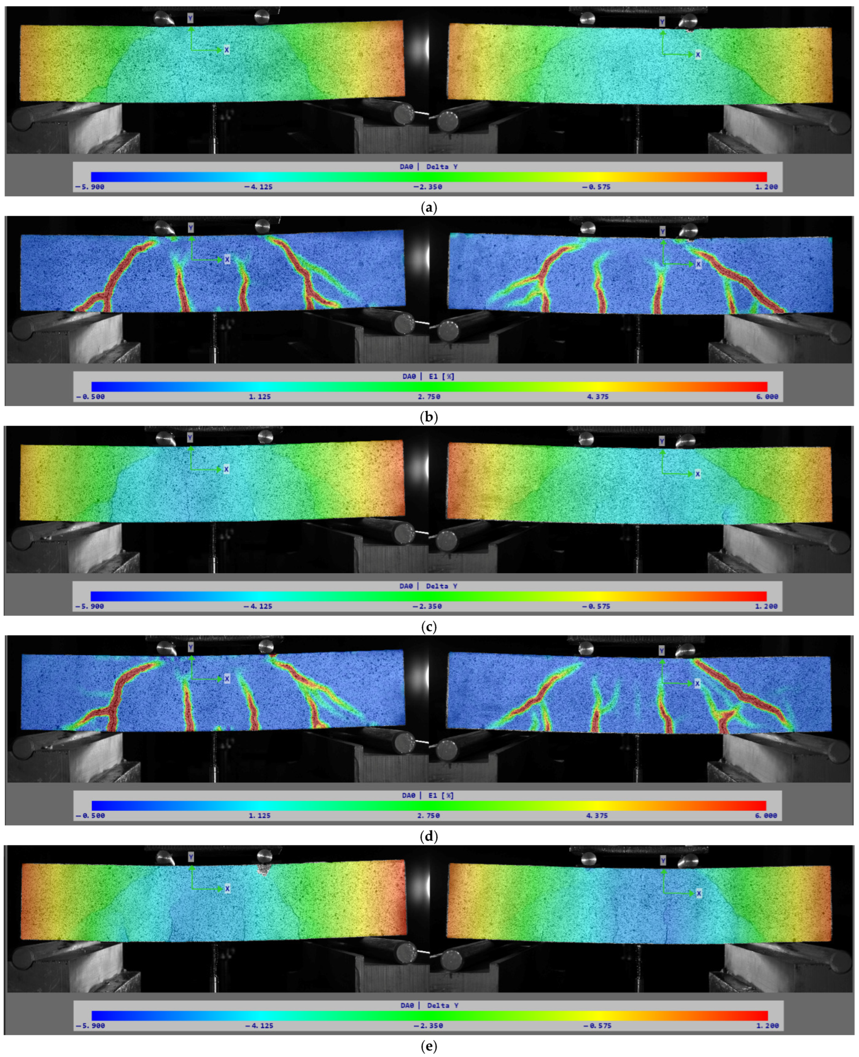Figure 8a–f show the DIC results for beams produced with Cement without additions (C) and CRT glass contents of 0%, 5%, and 10%.