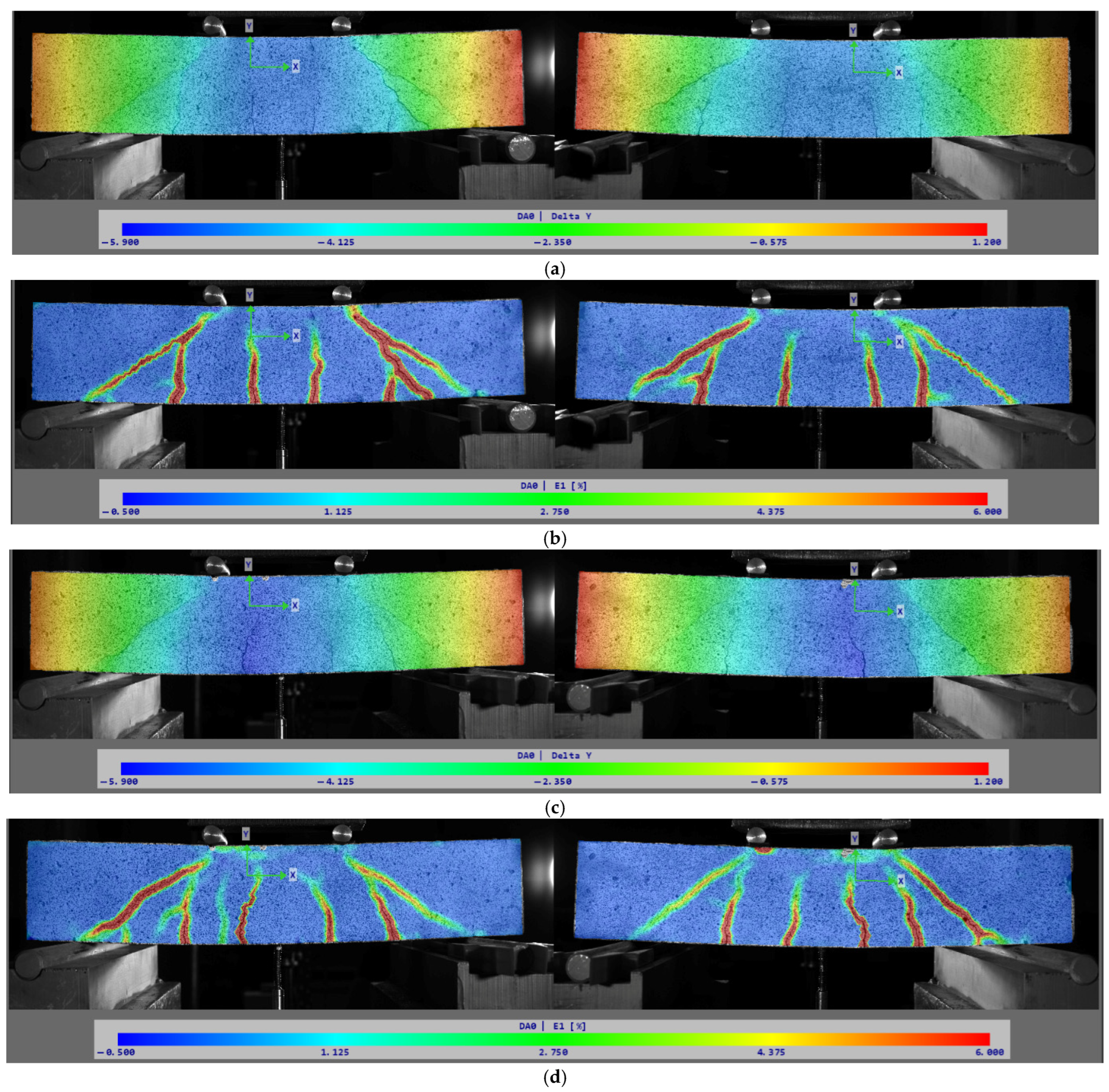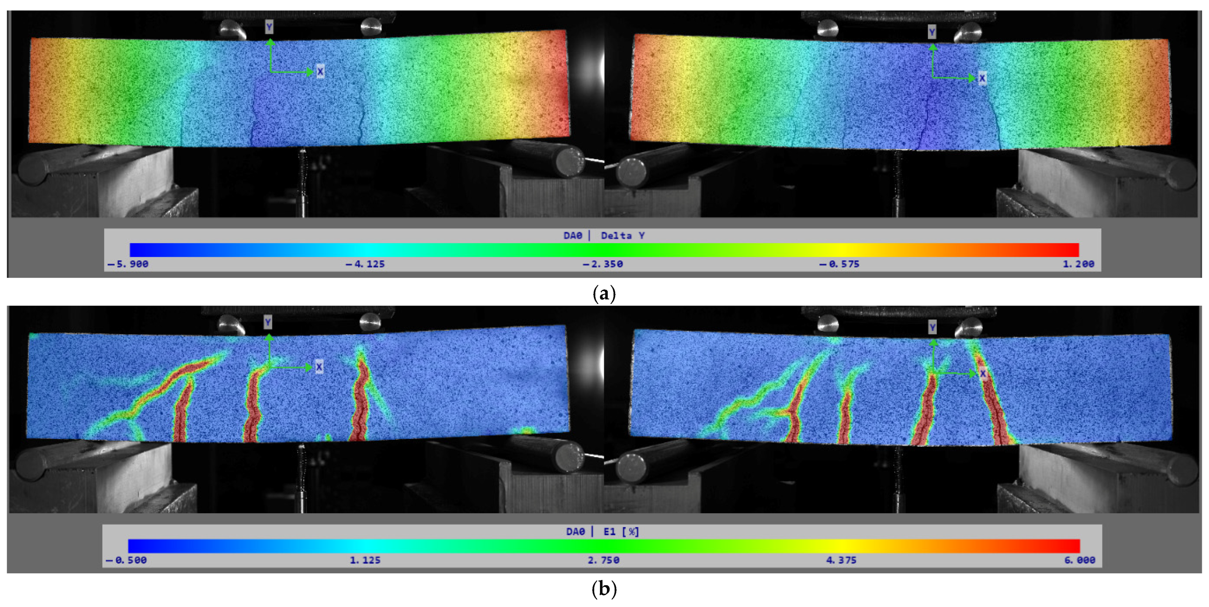 Figure 11) corroborate the DIC strain maps, with visible surface cracks coinciding with strain concentration zones. This alignment validates the precision of non-contact optical measurements and emphasizes the suitability of DIC for assessing strain distribution and crack evolution in small-scale beams.