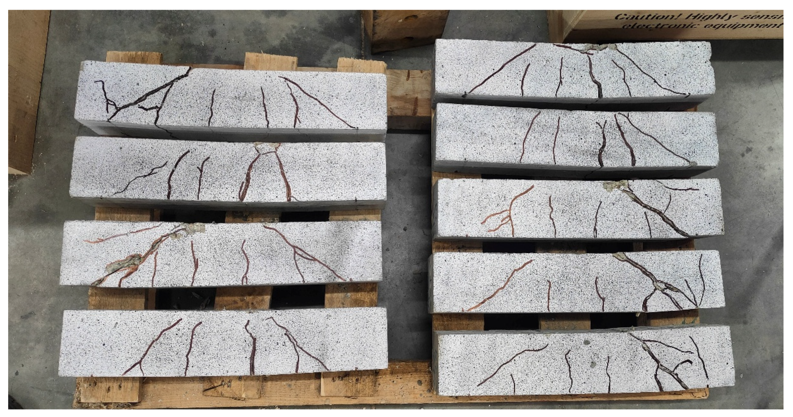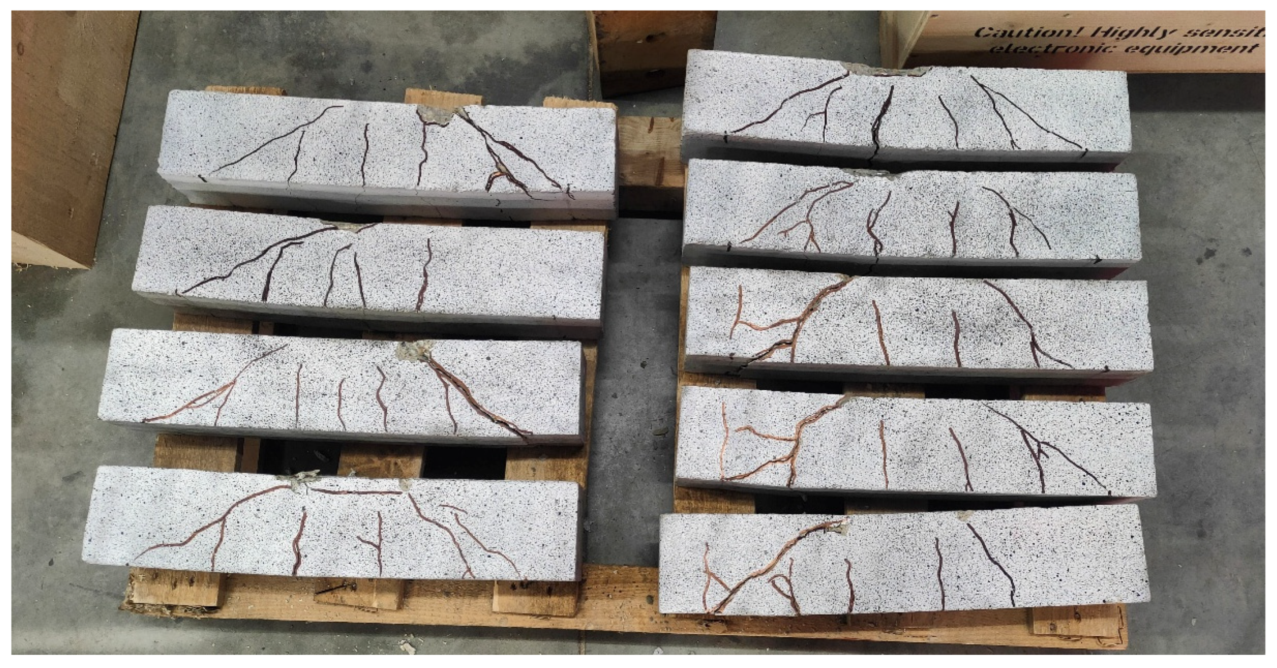 To ensure consistent curing for all specimens, the following curing regime was applied. All concrete specimens—including cubes, prisms, and reinforced concrete beams—were demolded after 24 h and subsequently water-cured at 20 ± 2 °C for 28 days in a controlled curing room maintained at relative humidity above 95%, in accordance with EN 12390 recommendations.