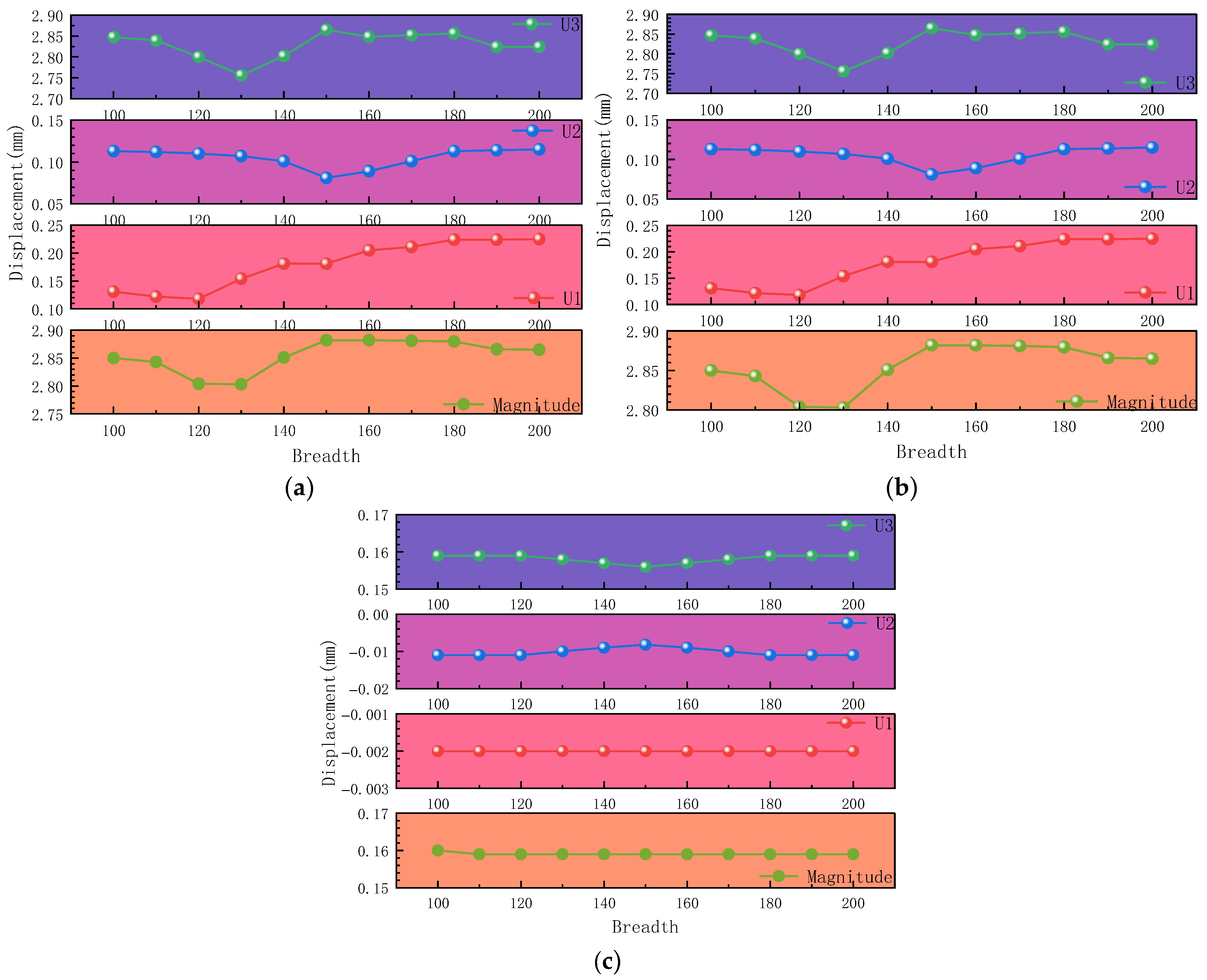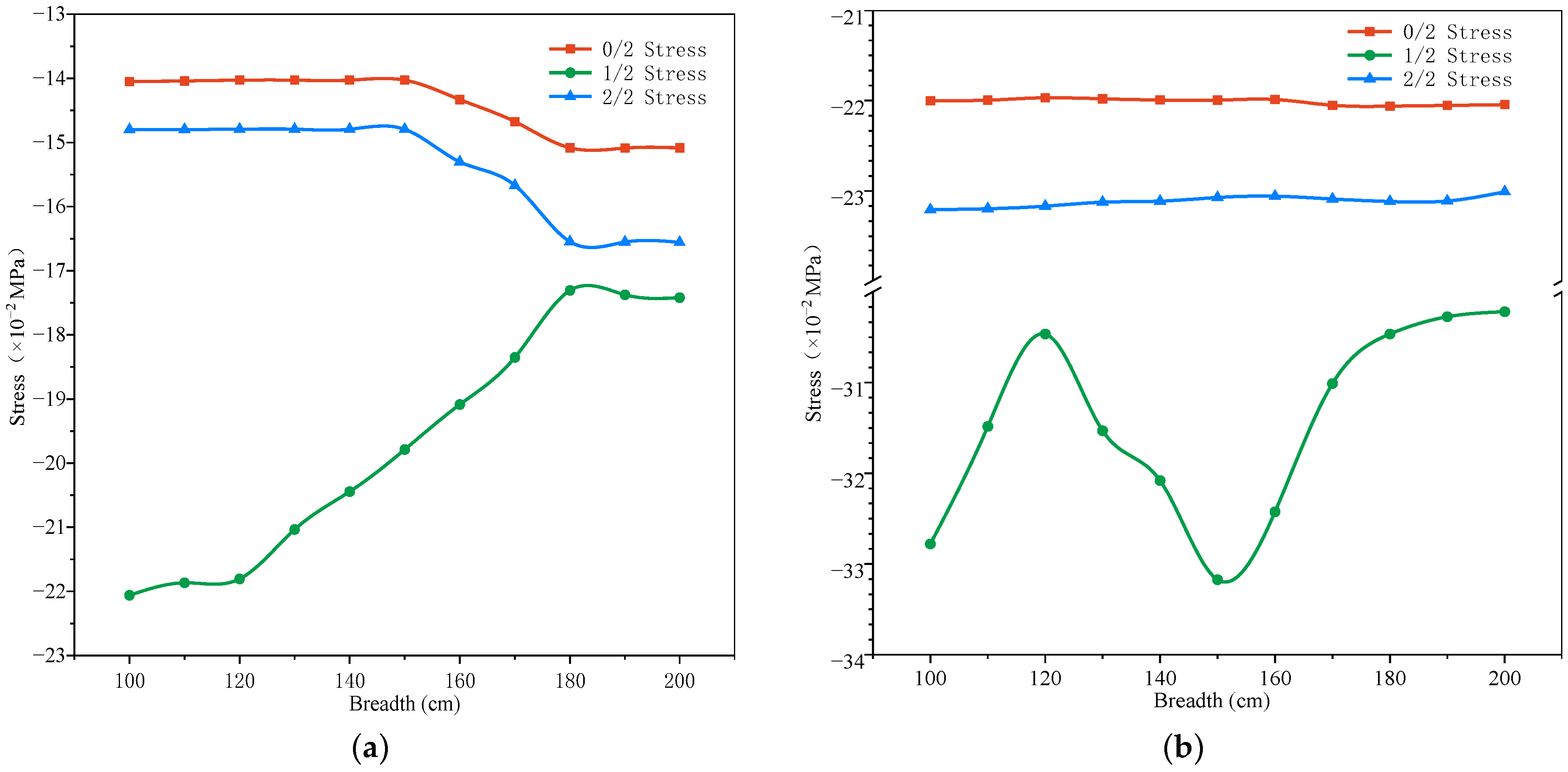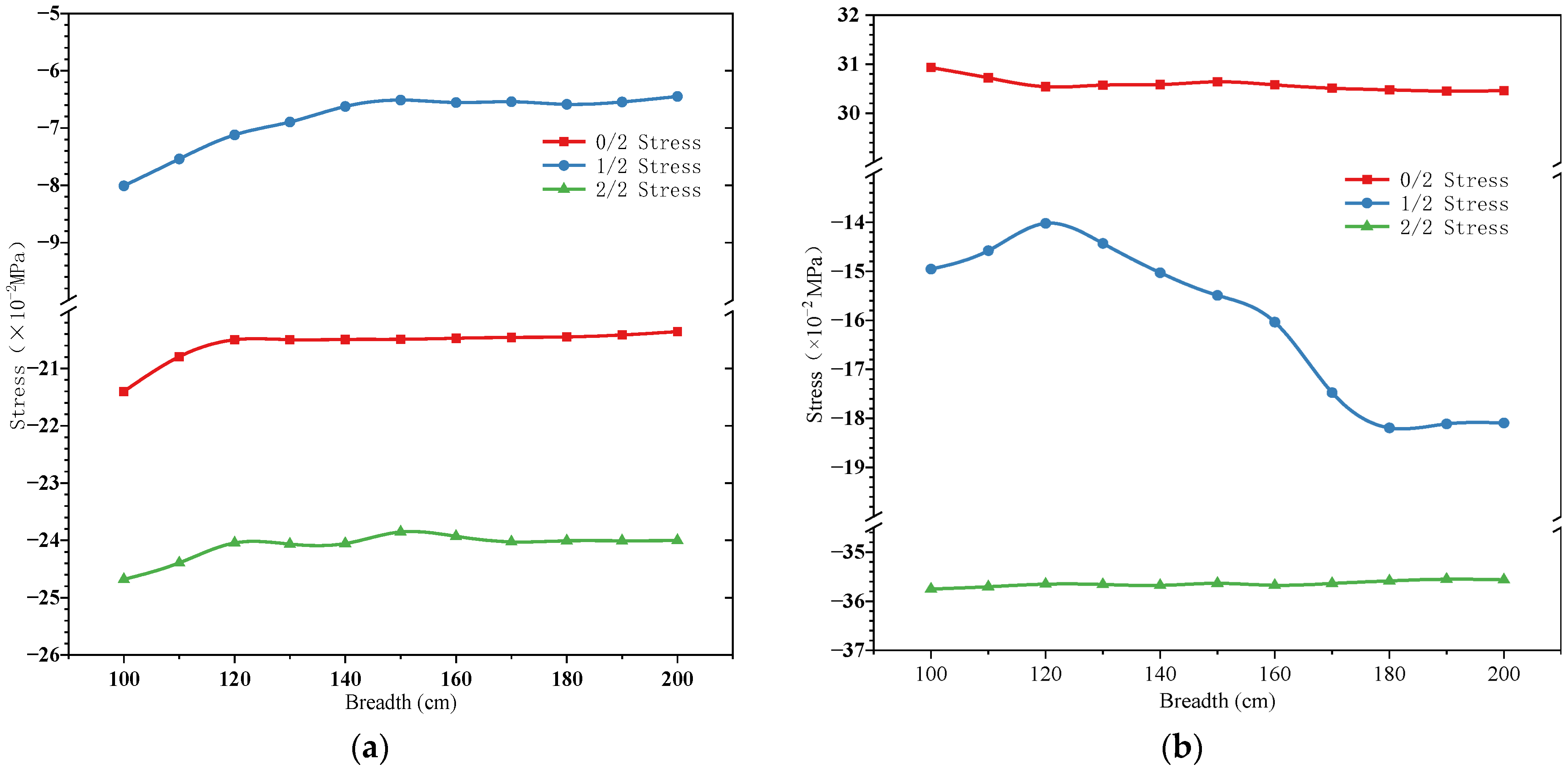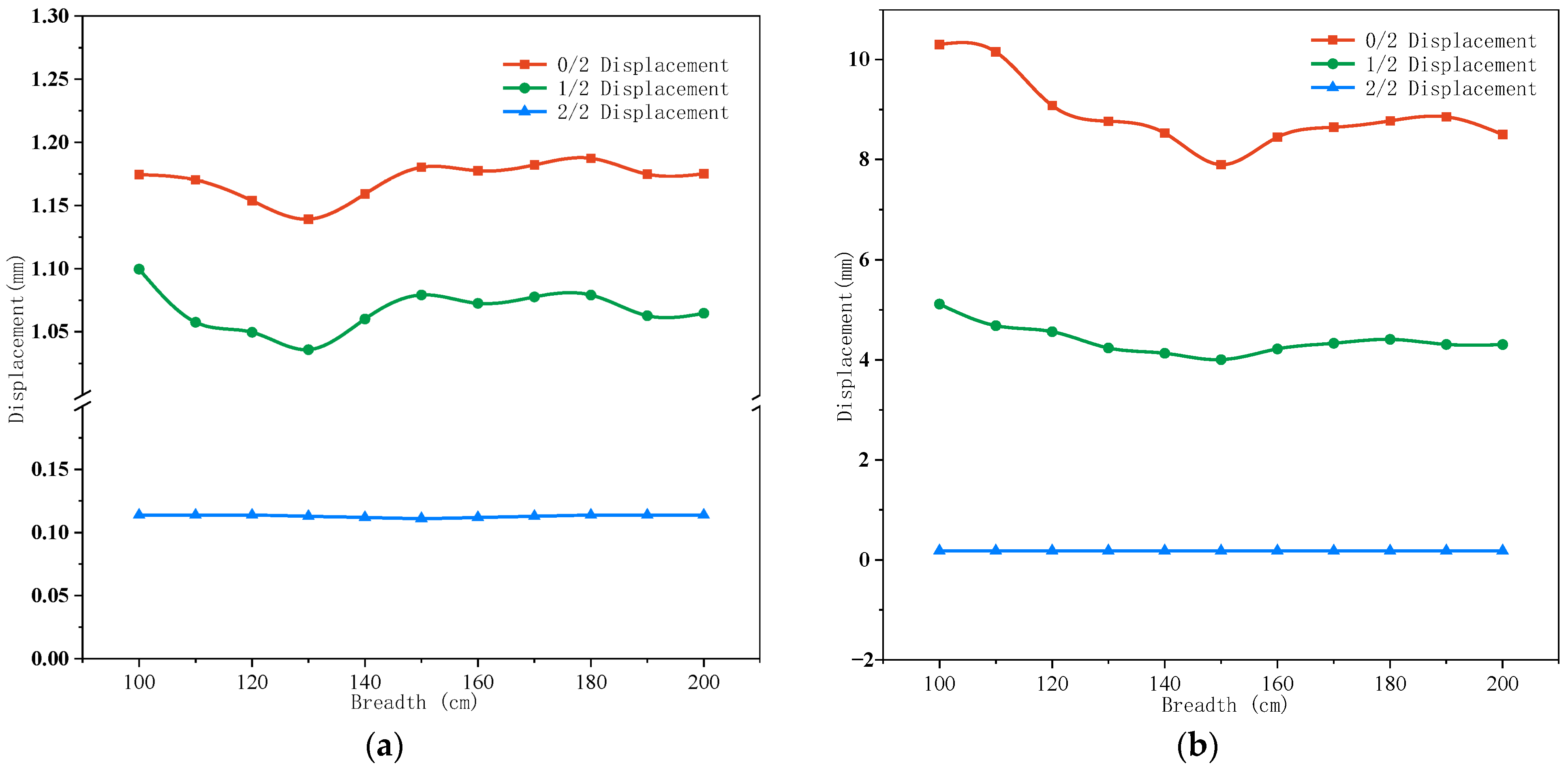 - Strengthening width significantly affects the structural response, with the most pronounced effect observed at the pier’s mid-height (L/2) section. Both stress distribution and displacement variations show substantial sensitivity to width changes under different loading conditions.