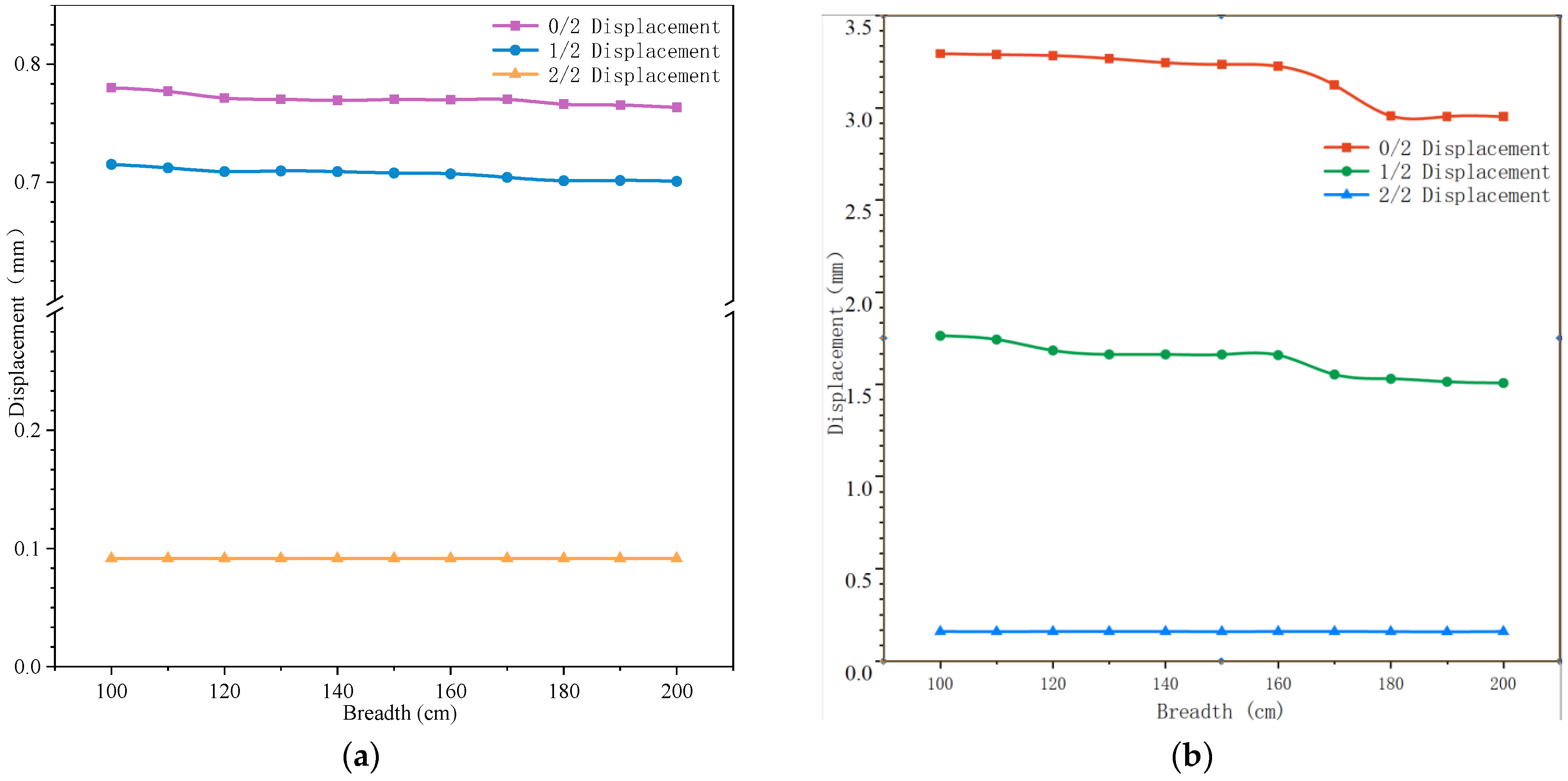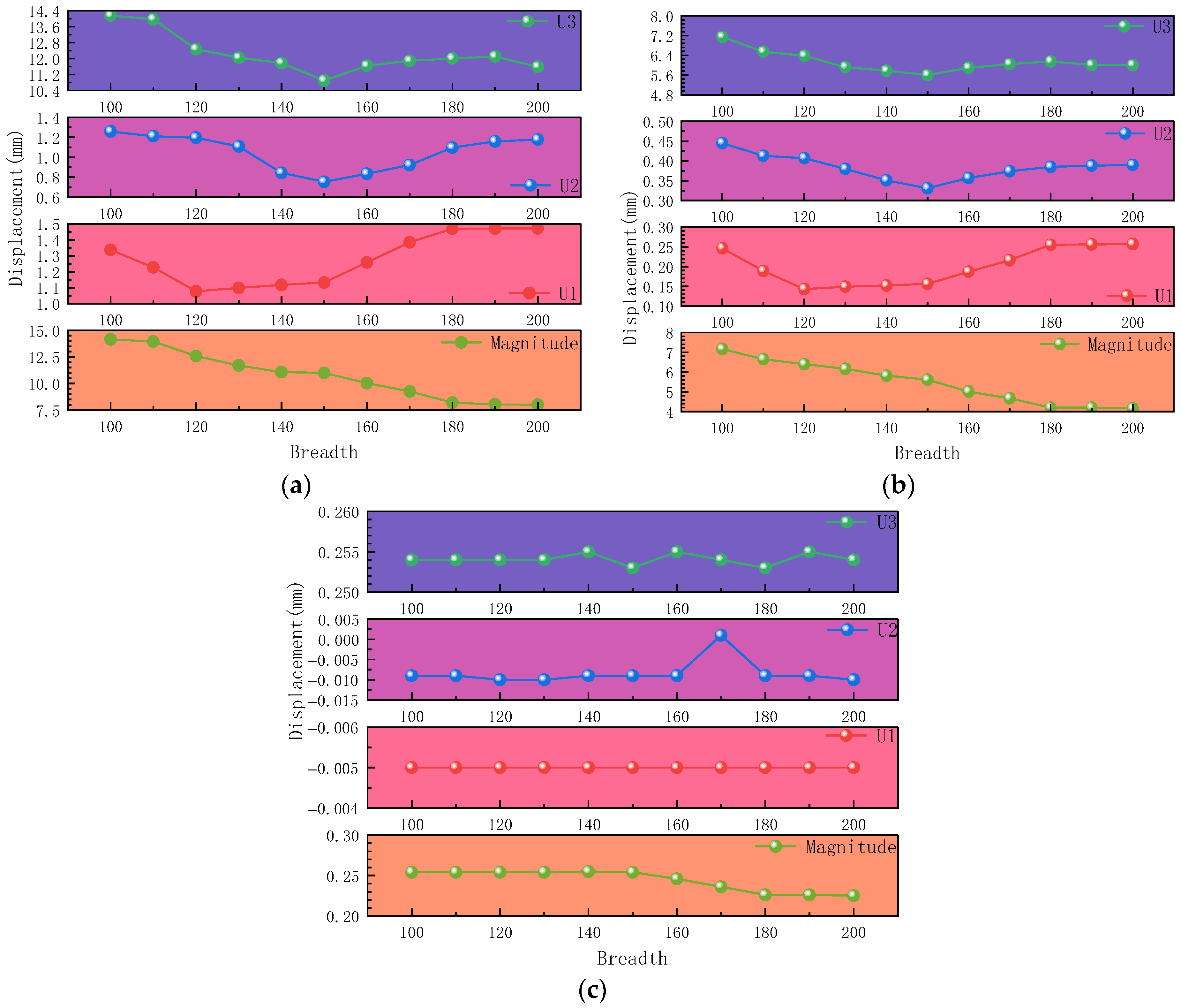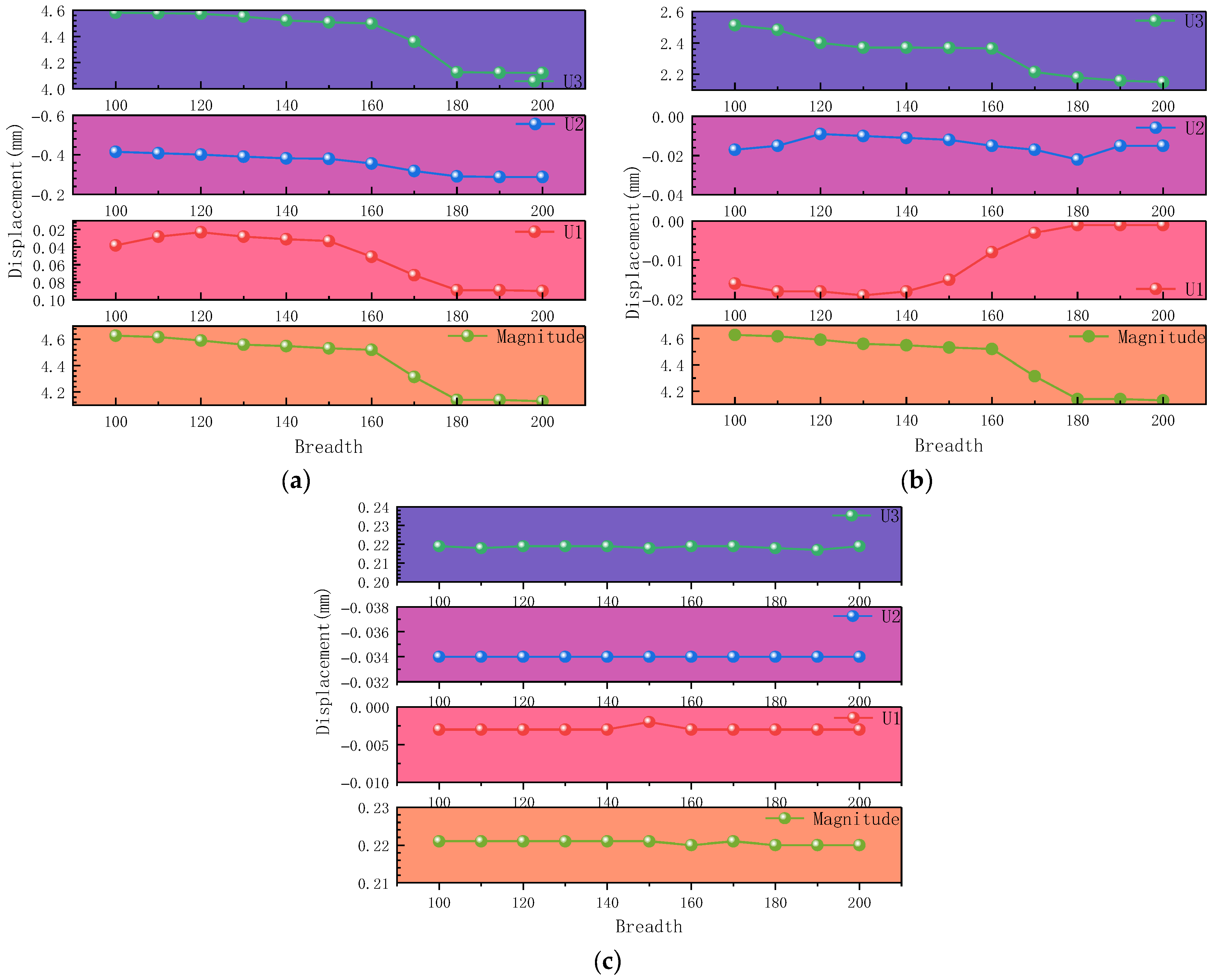 - Strengthening width significantly affects the structural response, with the most pronounced effect observed at the pier’s mid-height (L/2) section. Both stress distribution and displacement variations show substantial sensitivity to width changes under different loading conditions.