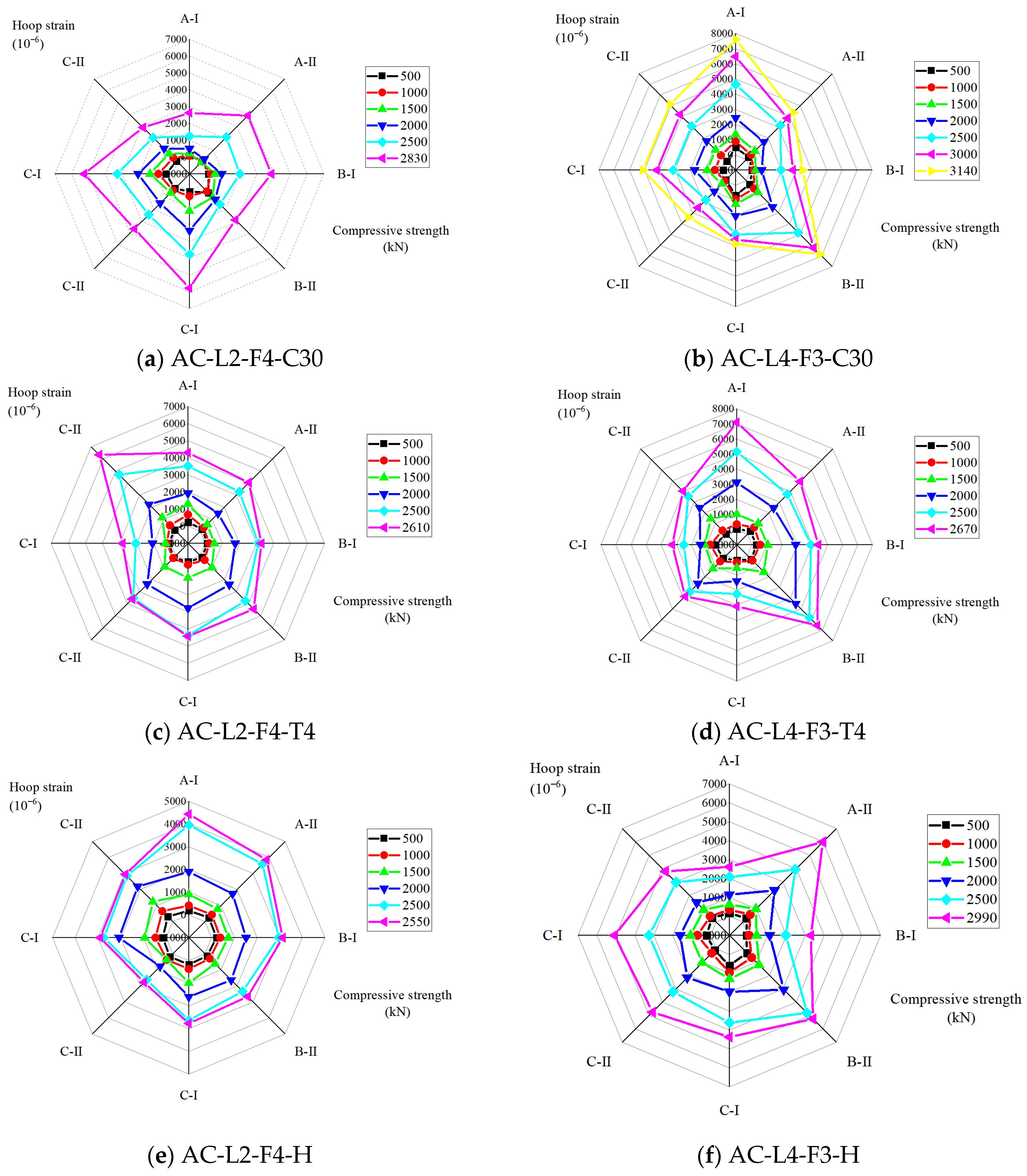 | Label | Actual Hoop Rupture Strain (10−6) | Ultimate Axial Strain (10−6) | Ultimate Stress of Concrete (MPa) | Peak Loads of MCPLs (kN) | ||||||||