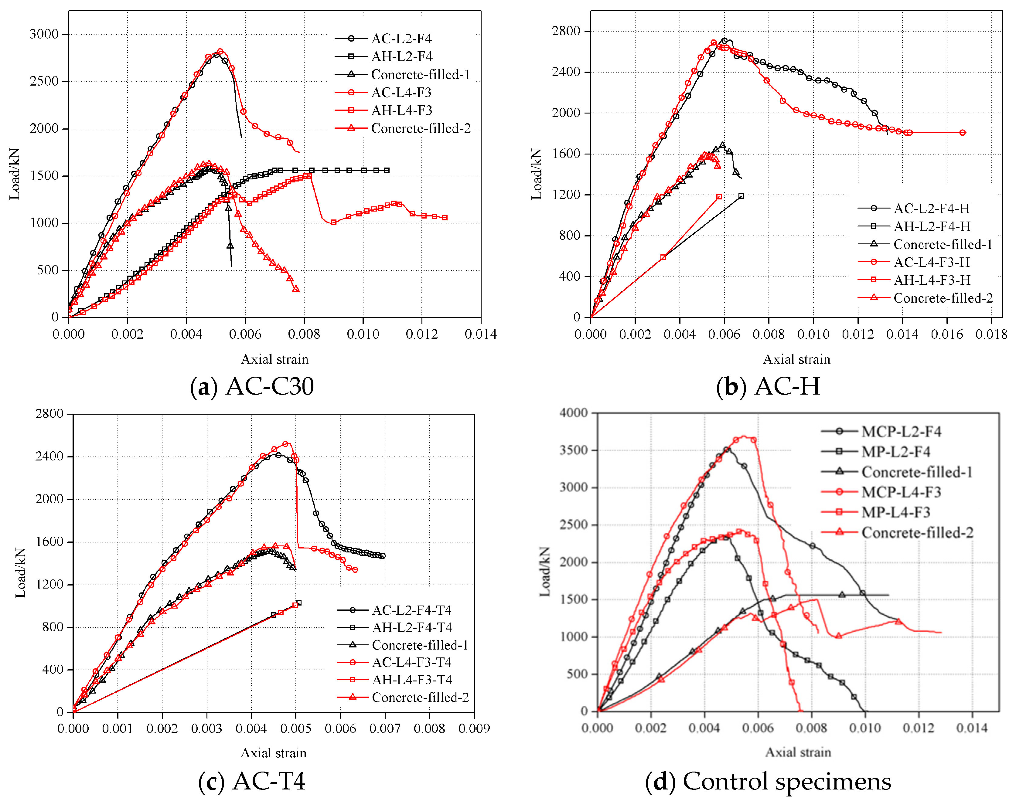 - Ozbakkaloglu, T. Compressive behavior of concrete-filled FRP tube columns: Assessment of critical column parameters. Eng. Struct. 2013, 51, 188–199. [Google Scholar] [CrossRef]