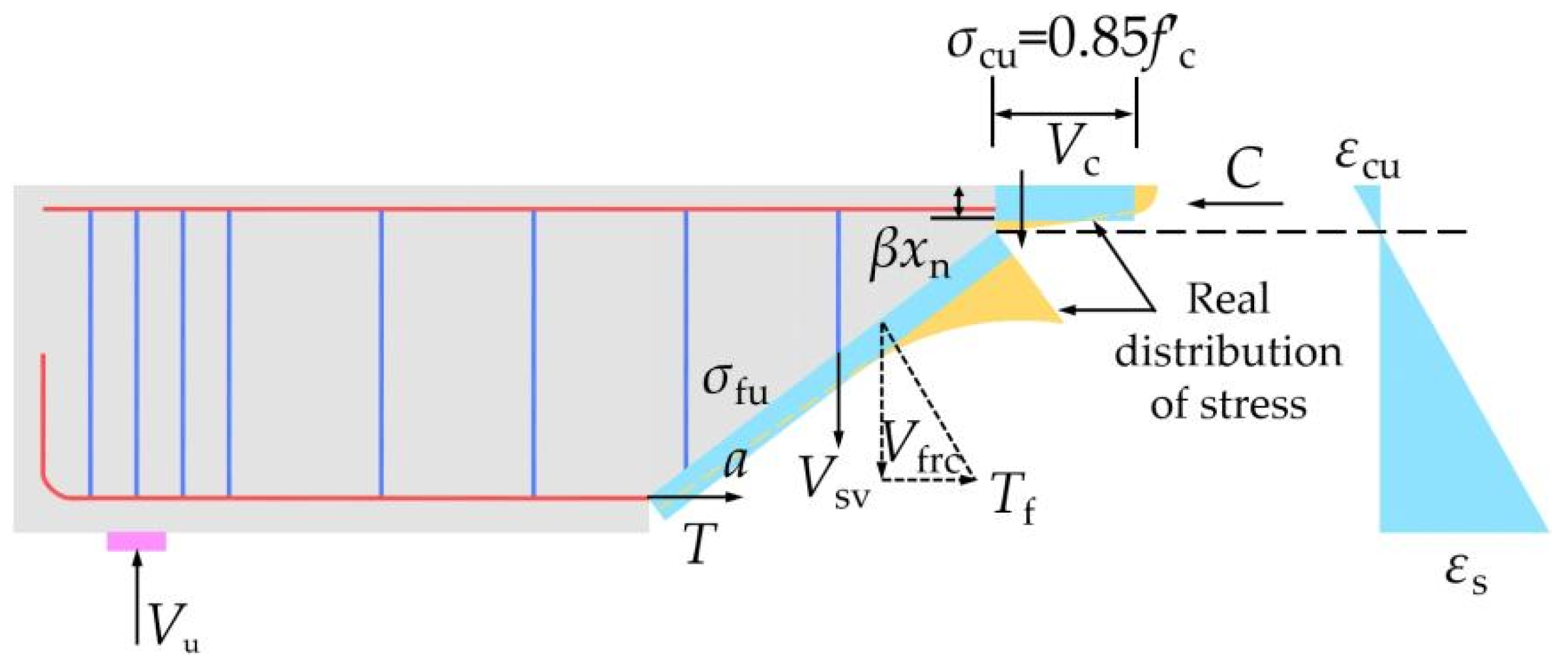 | Bi et al. [141] | Vu = Vc + Vf + Va + Vd | Vc is the shear bearing capacity provided by the concrete in the compression zone. Vf is the shear bearing capacity provided by the oblique crack section steel fiber. Va is the shear bearing capacity provided by aggregate bite force. Vd is the shear bearing capacity provided by the dowel action of longitudinal steel rebar. |