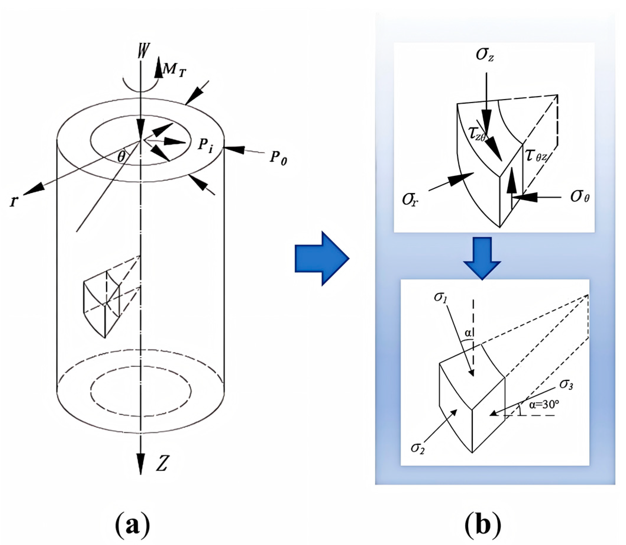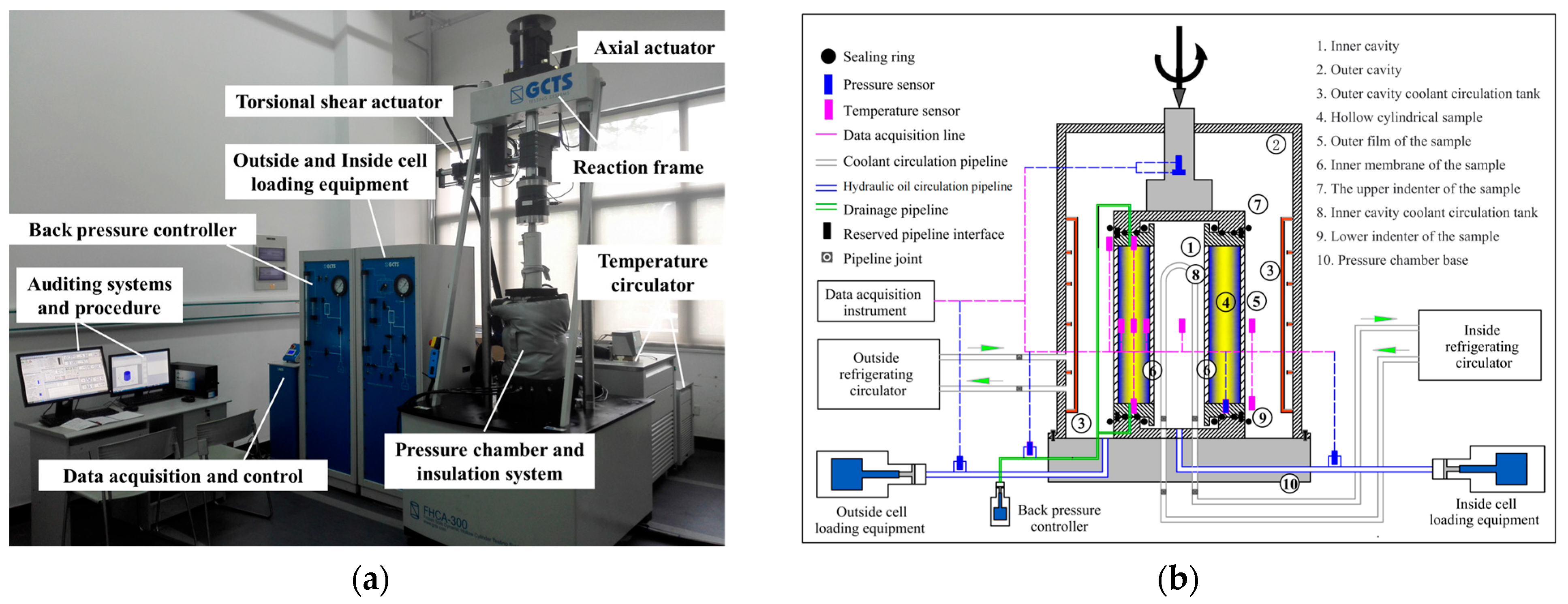 This study bridges these gaps through an integrated experimental and analytical investigation of pressurized frozen sand under directional shear conditions. Specifically, we conduct the following: (1) Employ a custom-developed frozen soil hollow cylinder apparatus (FS-HCA) to simulate in situ pressurized freezing (0.5–6 MPa) and complex stress paths (b = 0.5, α = 30°). (2) Systematically quantify the influence of mean principal stress (p) on the deformation, strength, and failure mechanisms of pressurized frozen saturated medium sand at −10 °C. (3) Develop a practical failure criterion and identify key behavioral transitions to inform energy-efficient AGF design. (4) Provide microstructural interpretations for the observed macroscopic responses. The outcomes of this research provide both scientific understanding and practical tools to advance AGF as a sustainable ground stabilization technology, supporting the construction industry’s transition toward low-carbon underground development in challenging hydrogeological conditions.